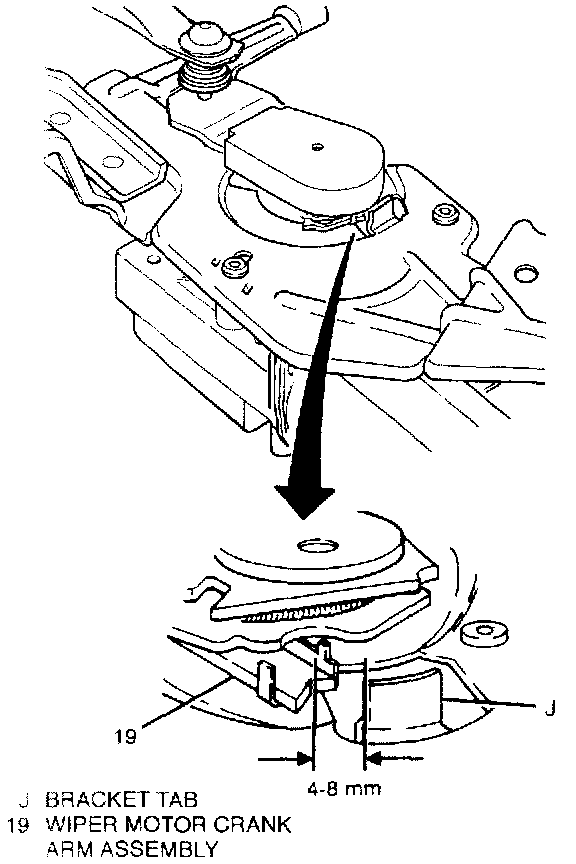 H. Check gap between wiper motor crank arm assembly (19) and bracket tab (J). If gap is not 4 - 8 mm (0.157-0.314 in.), remove crank arm assembly (19) and repeat installation step 3.
