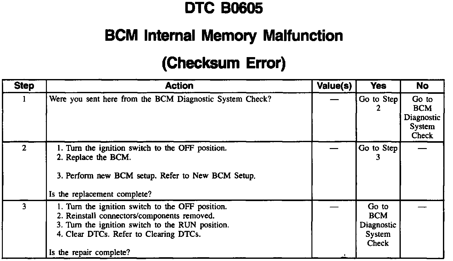^ Since the EEPROM is n0t removable from the BCM module and a DTC B0605 is an internal malfunction to the BCM. There is no repair procedure for this malfunction and module replacement is necessary. A service replacement BCM must be programmed and configured to the vehicle that is receiving the installation. Using a scan tool, make sure the BCM is properly programmed and configured for the correct PASS-Key (R) II and option content for that vehicle. Refer to New BCM Setup.