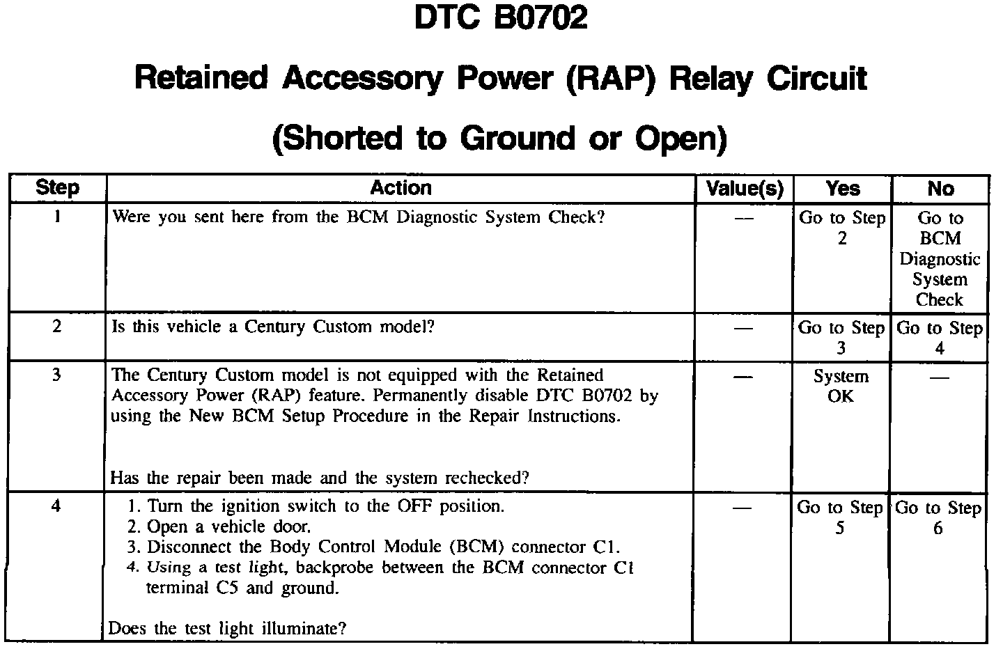 ^ If DTC B0702 is set on a Century Custom model, DTC B0702 should be permanently disabled by using the service programming setup procedure.