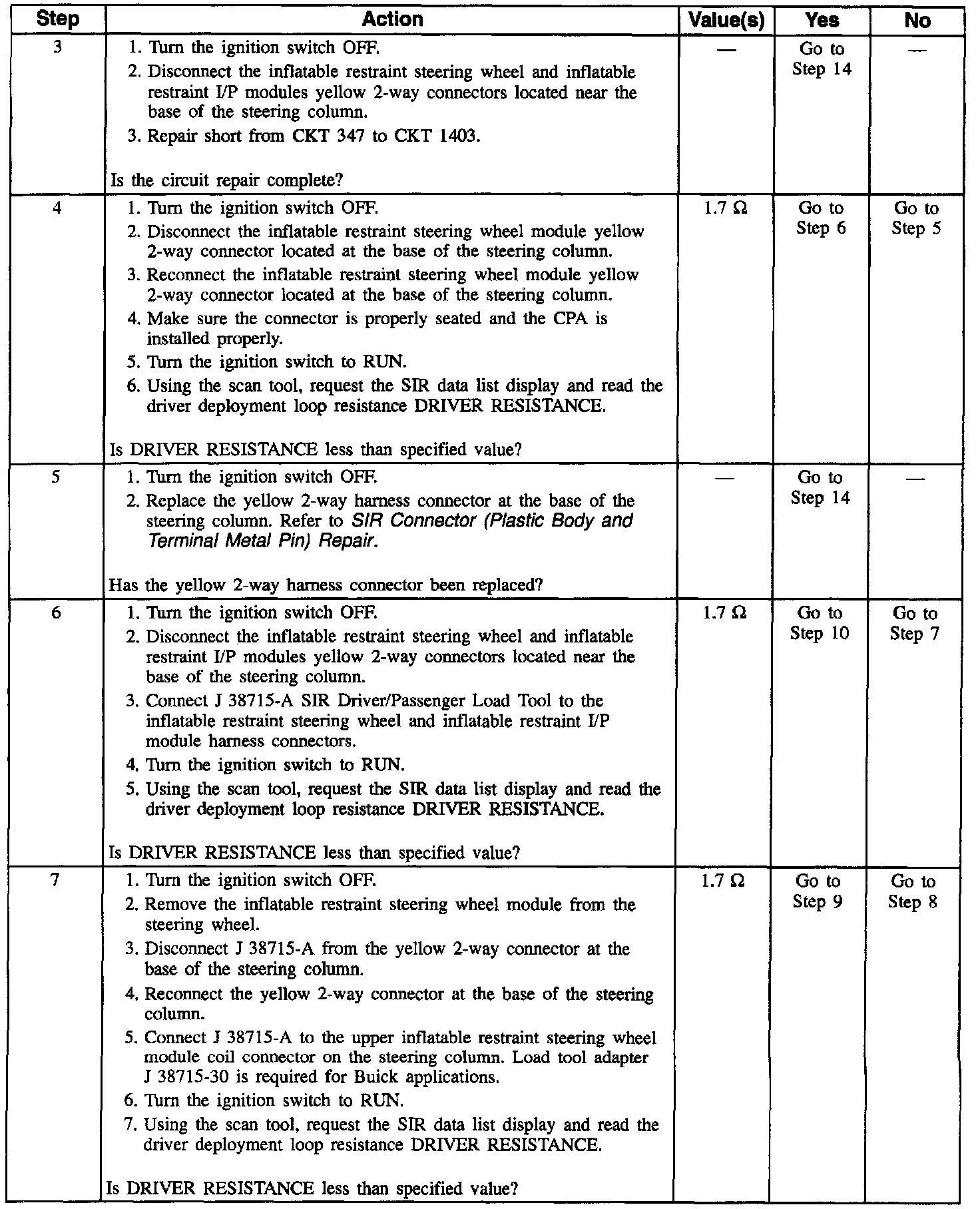 6. This test isolates the malfunction to one side of the inflatable restraint steering wheel module coil yellow 2-way connector located at the base of the steering column.