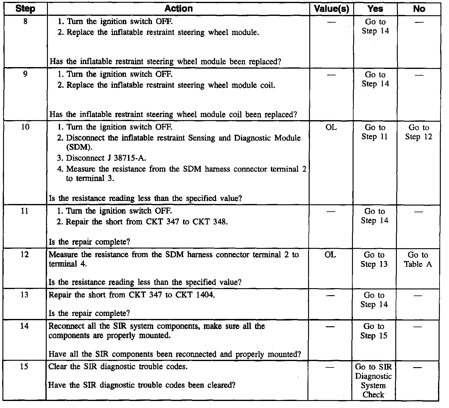 7. This test determines whether the malfunction is in the inflatable restraint steering wheel module coil or the inflatable restraint steering wheel module. This is done by substituting the known good resistance of the load tool and then observing if the malfunction is still present.