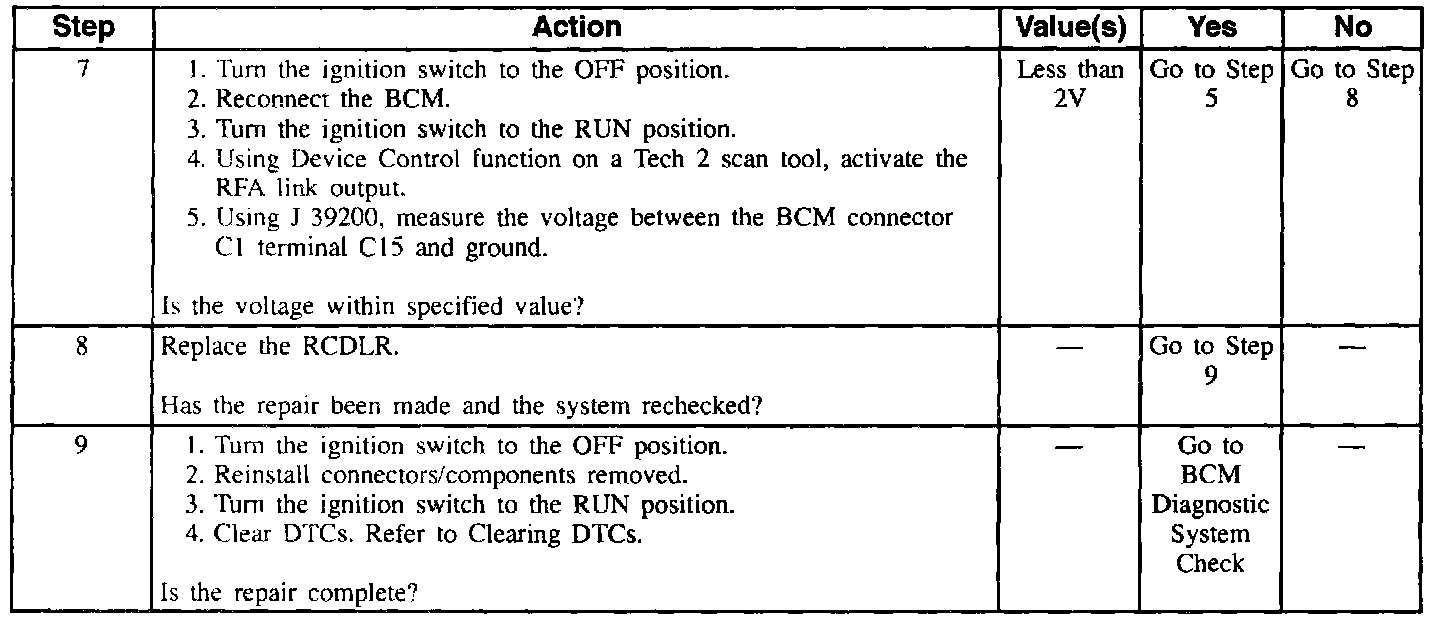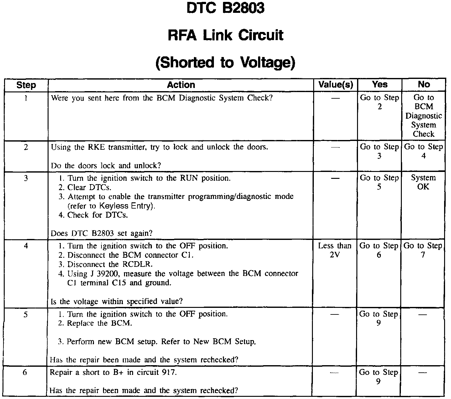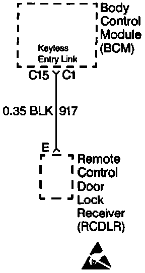 The Body Control Module (BCM) has the ability to enable the transmitter programming/diagnostic mode (refer to Keyless Entry for entering this mode) of this receiver. The BCM will detect and prevent message collisions on the RFA link. The BCM also receives programming signals from the Remote Control Door Lock Receiver (RCDLR). When the BCM tries to enable the transmitter programming/diagnostic mode and cannot pull the RFA link circuit to ground due to a short to voltage, the BCM sets DTC B28003.