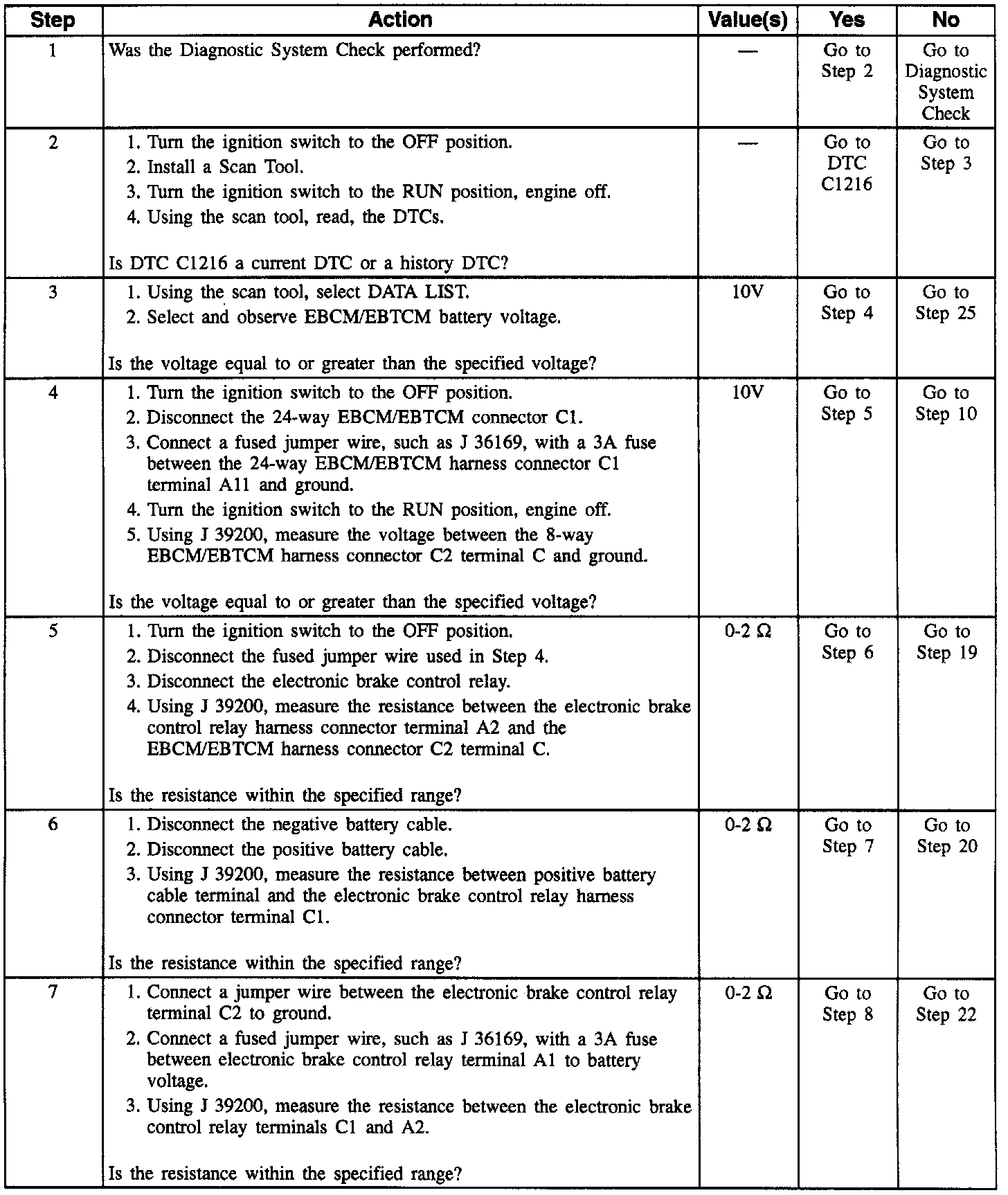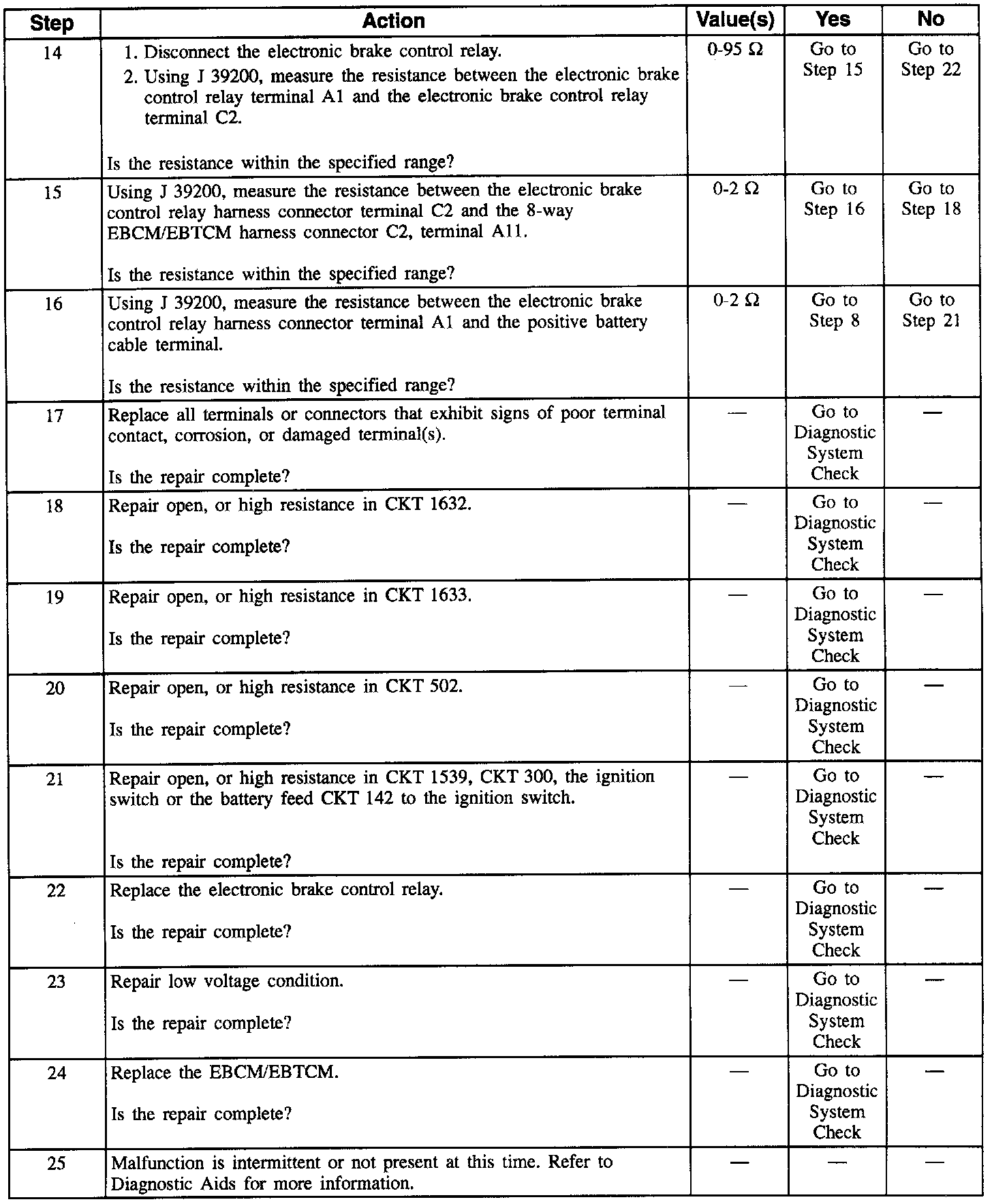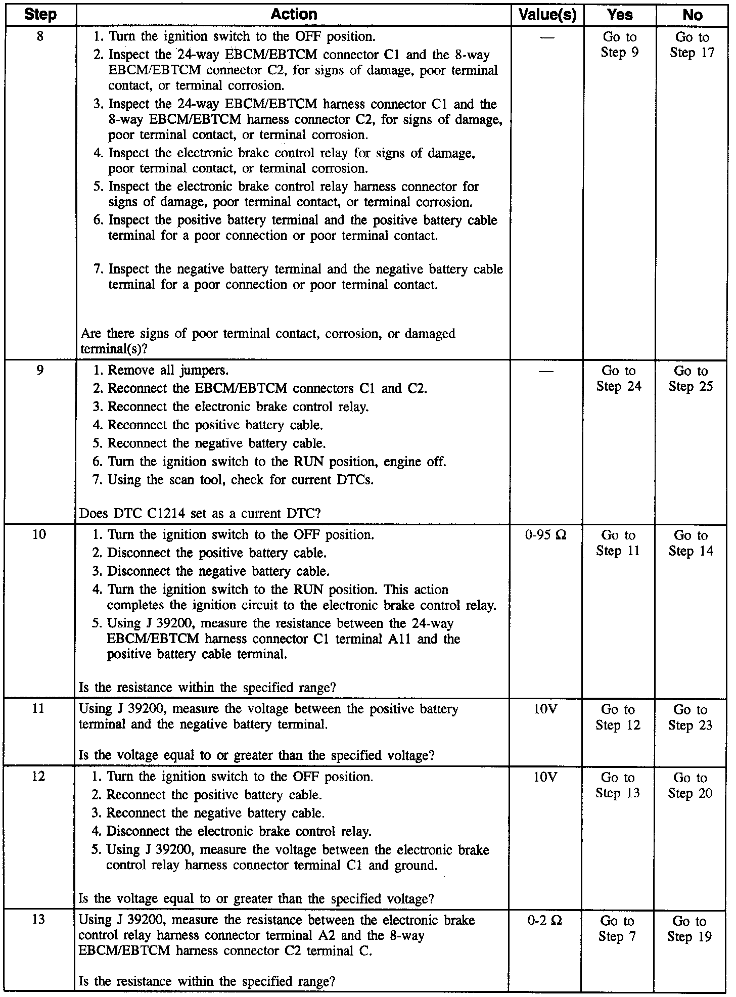 Check for vibration effects by performing the relay test function of the Scan Tool. With the relay test commanded on, lightly tap the top and sides of the electronic brake control relay while monitoring the electronic brake control relay voltage. If the electronic brake control relay voltage changes significantly, replace the electronic brake control relay. If DTC C1214 only sets when the vehicle is initially started in cold ambient conditions (temperature less than 0�C 32�F), replace the electronic brake control relay.