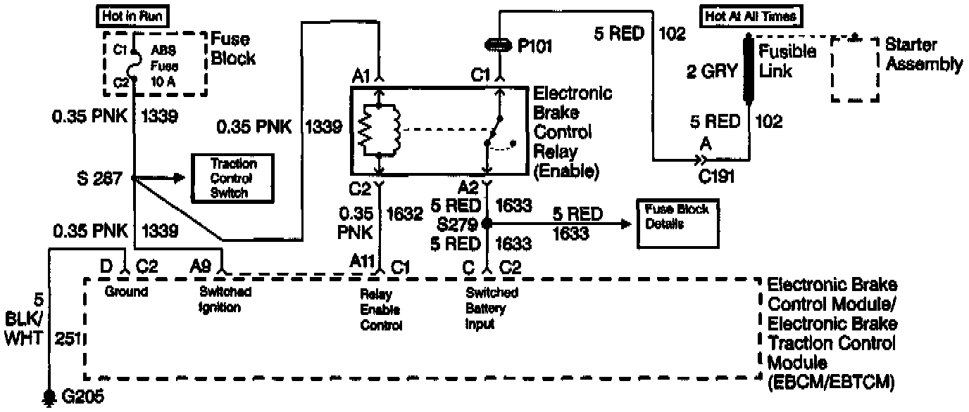 Ignition voltage is supplied through terminal A1 of the electronic brake control relay. The EBCM/EBTCM is then able to energize the pull-in coil by completing the ground circuit at connector C1 terminal All of the EBCM/EBTCM. The magnetic field created closes the electronic brake control relay contacts and allows battery voltage and current through the electronic brake control relay terminal C1 to be supplied to the EBCM/EBTCM through connector C2 terminal C, which supplies power to the motors and solenoids.