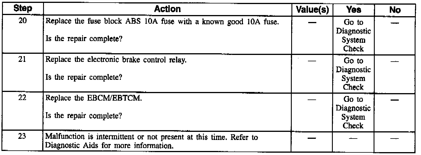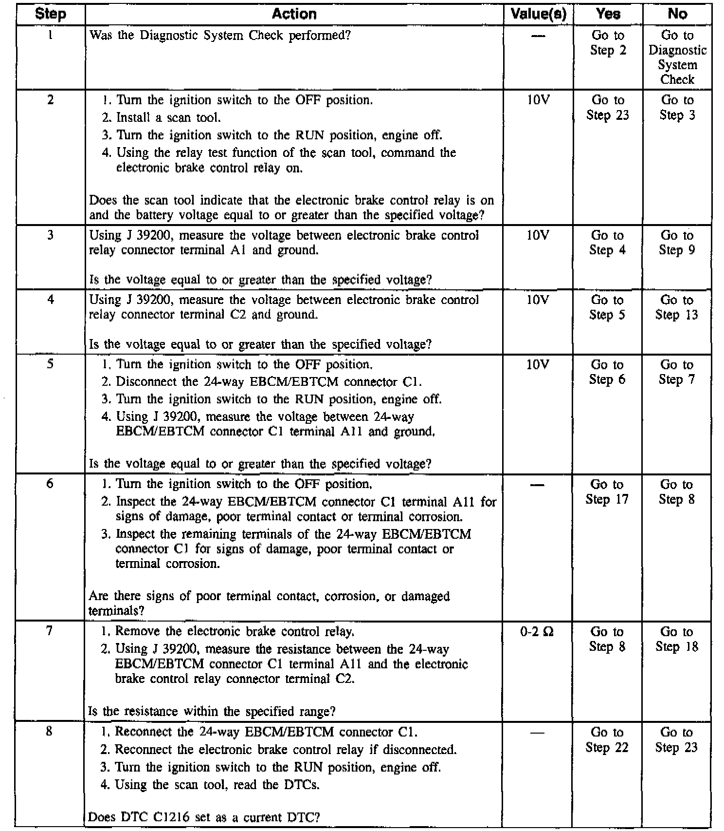 DTC C1216 can be set anytime. This test detects an open in the electronic brake control relay coil circuit. An open in this circuit will not allow the electronic brake control relay to be energized thus preventing voltage/current to the motors and solenoids. If this malfunction is present and the ignition is turned off before 5 km/h (3 mph) is reached, DTC C1214 is set alone.