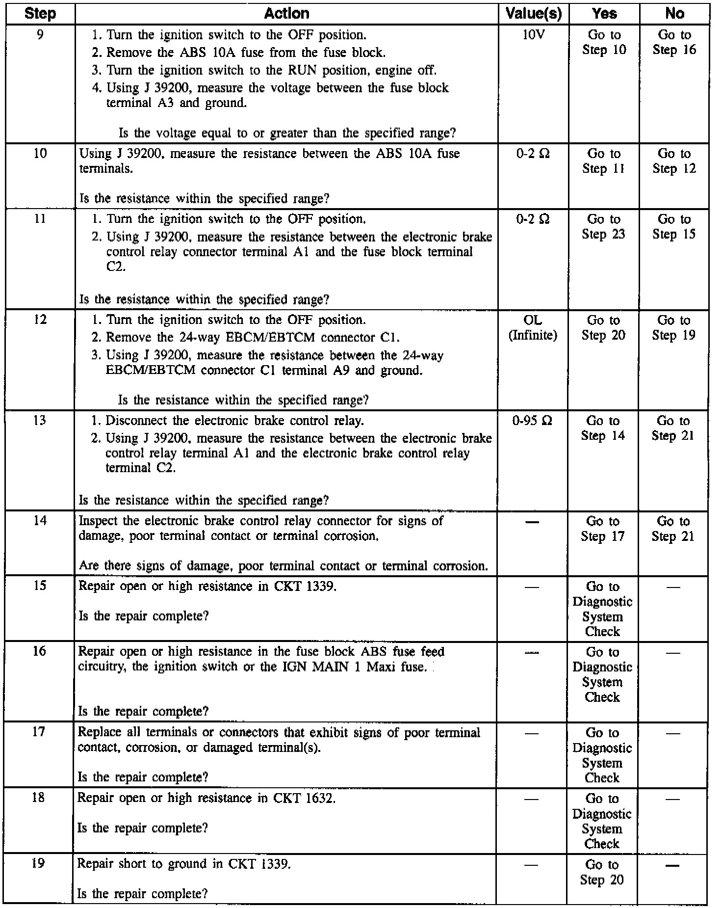 An intermittent malfunction may be caused by a poor connection, rubbed-through wire insulation, or a wire that is broken inside the insulation. The frequency of the malfunction can be checked by using the enhanced diagnostic function of the Scan Tool. If the frequency of the malfunction is high, but is currently intermittent, check for high coil resistance by measuring between electronic brake control relay terminals 85 and 86 using J 39200. If resistance is greater than 100 ohms, replace the electronic brake control relay. Any circuitry that is suspected of causing the intermittent complaint should be thoroughly checked for backed-out terminals, improper mating, broken locks, improperly formed or damaged terminals, poor terminal to wiring connections, or physical damage to the wiring harness.