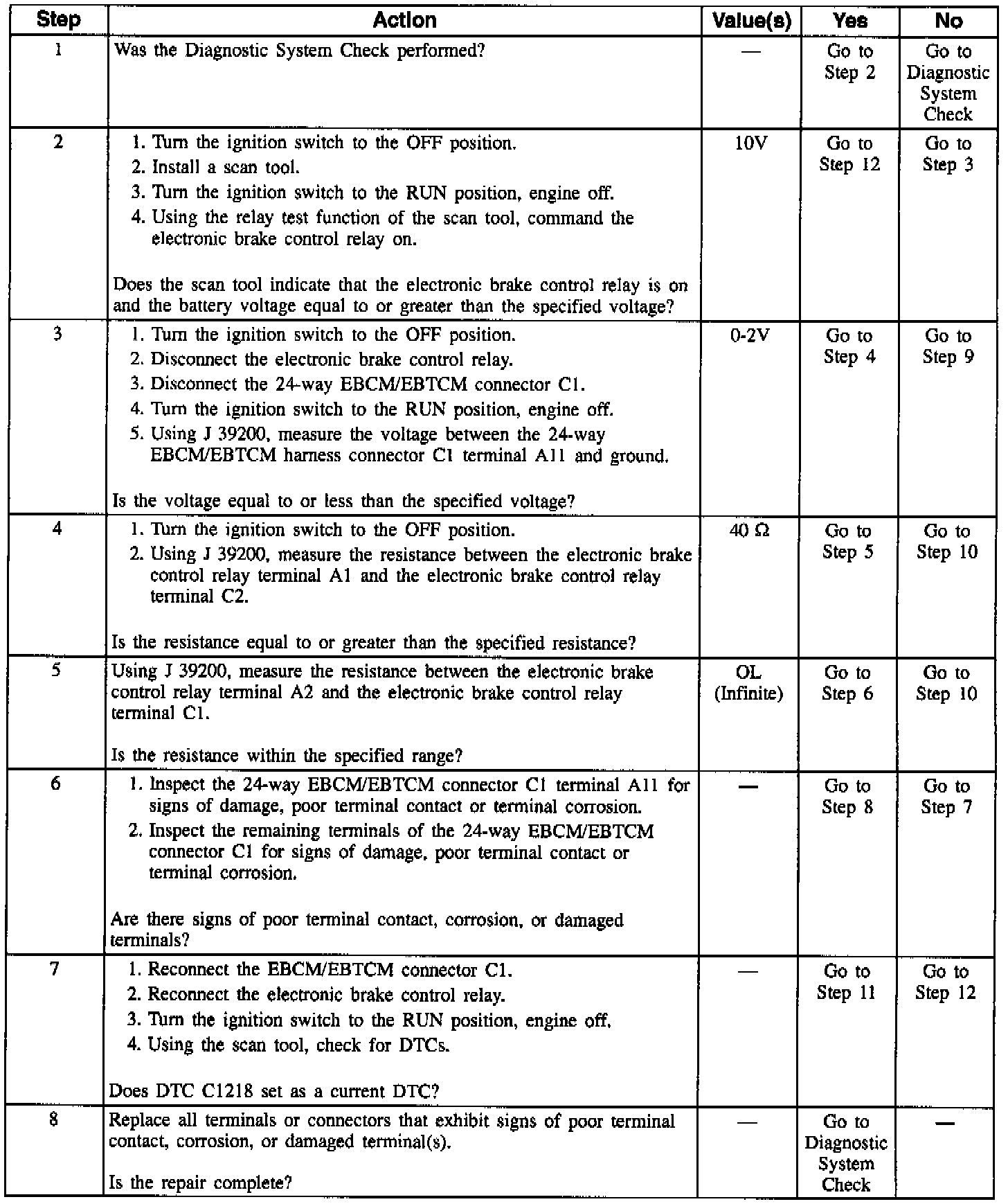 DTC C1218 can be set after the EBCM/EBTCM commands the electronic brake control relay on. This test monitors the availability of current/voltage to the motors and solenoids. A malfunction of this type will not allow voltage to be available to the motors and solenoids. Therefore, ABS/ETS operation would not be allowed if required.