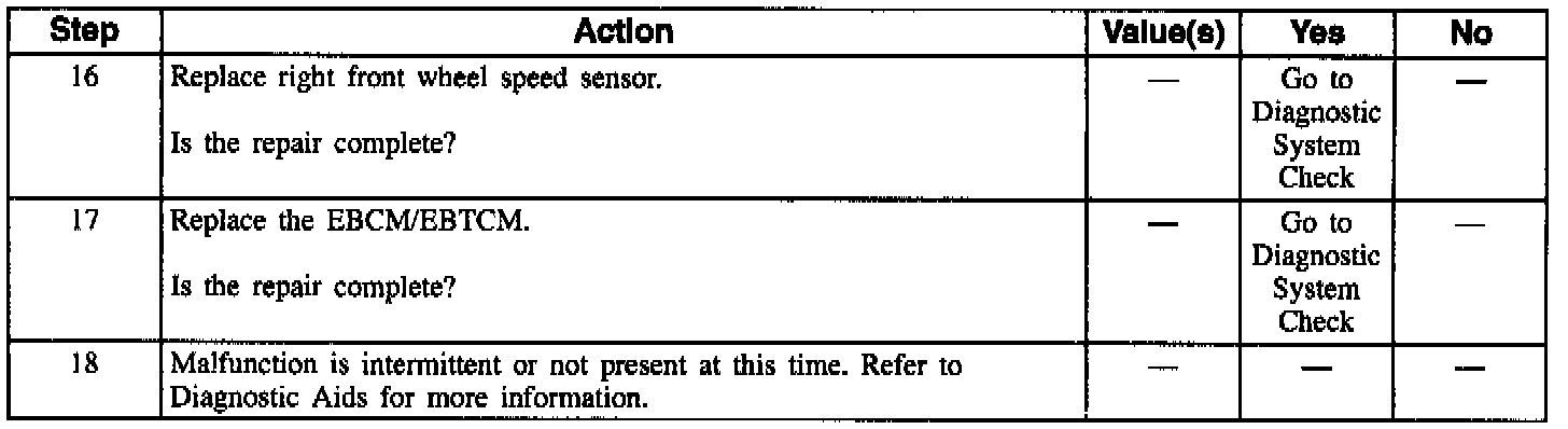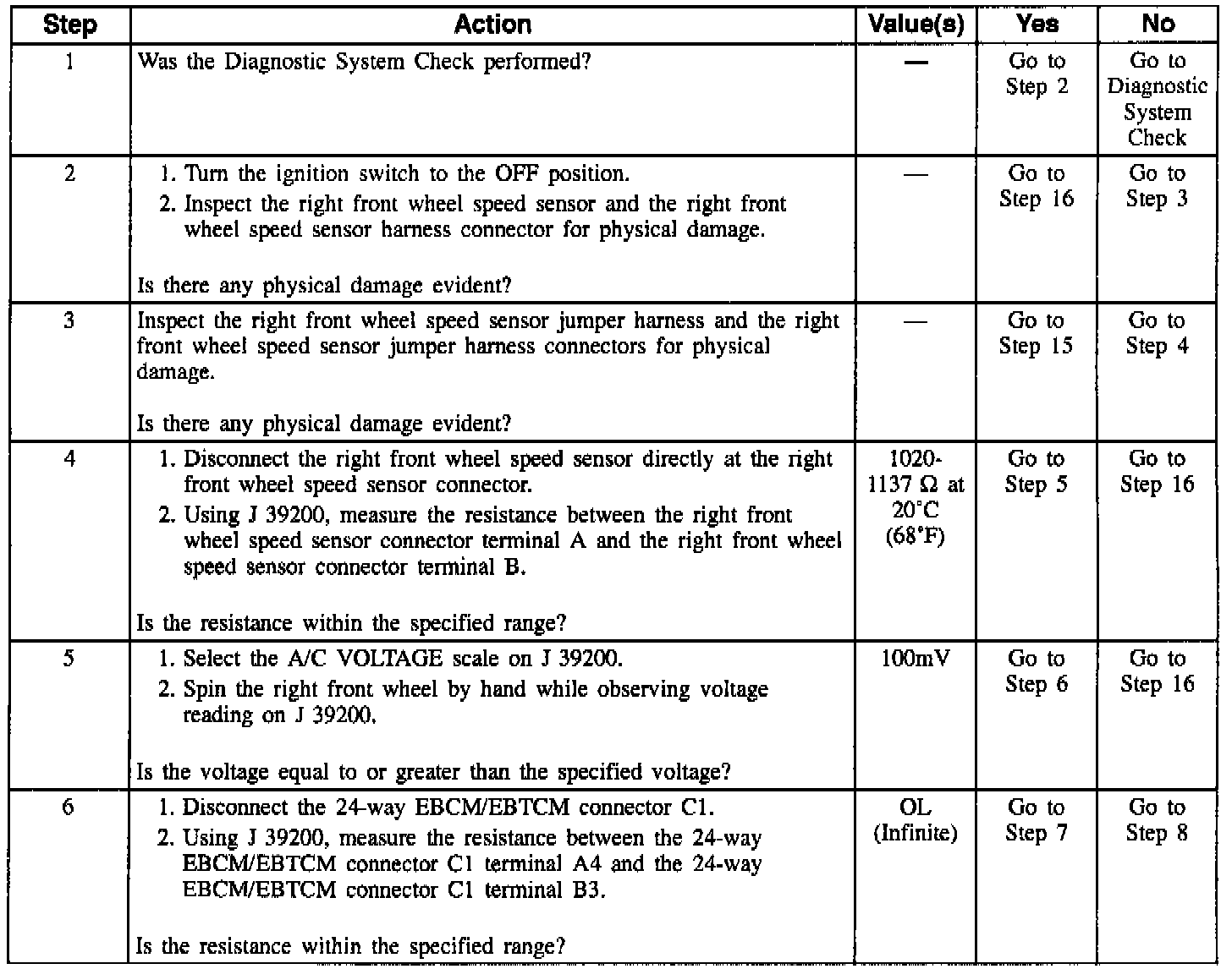 NOTE: Wheel speed sensor intermittent malfunctions may be difficult to locate. Care should be taken not to disturb any electrical connections prior to an indicated step of the diagnosis table. This will ensure that an intermittent condition will not be corrected before the source of the malfunction is found.