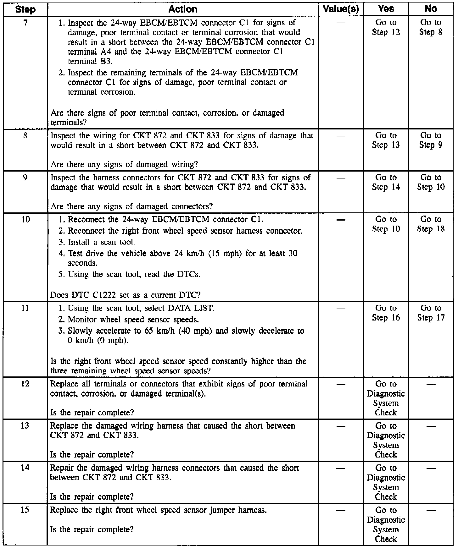 DTC C1222 can be set when the vehicle is not in an ABS stop. If the right front wheel speed sensor input signal = 0 and the vehicle's reference speed is greater than 8 km/h (5 mph), a malfunction exists.