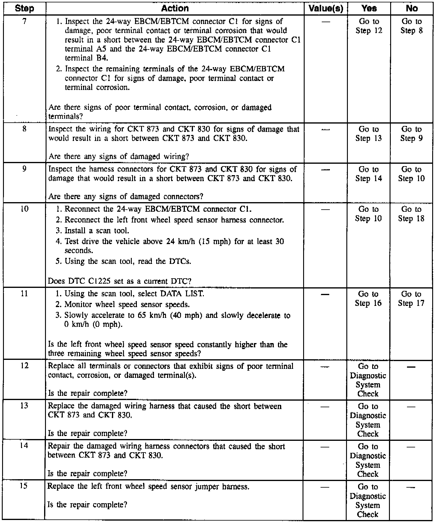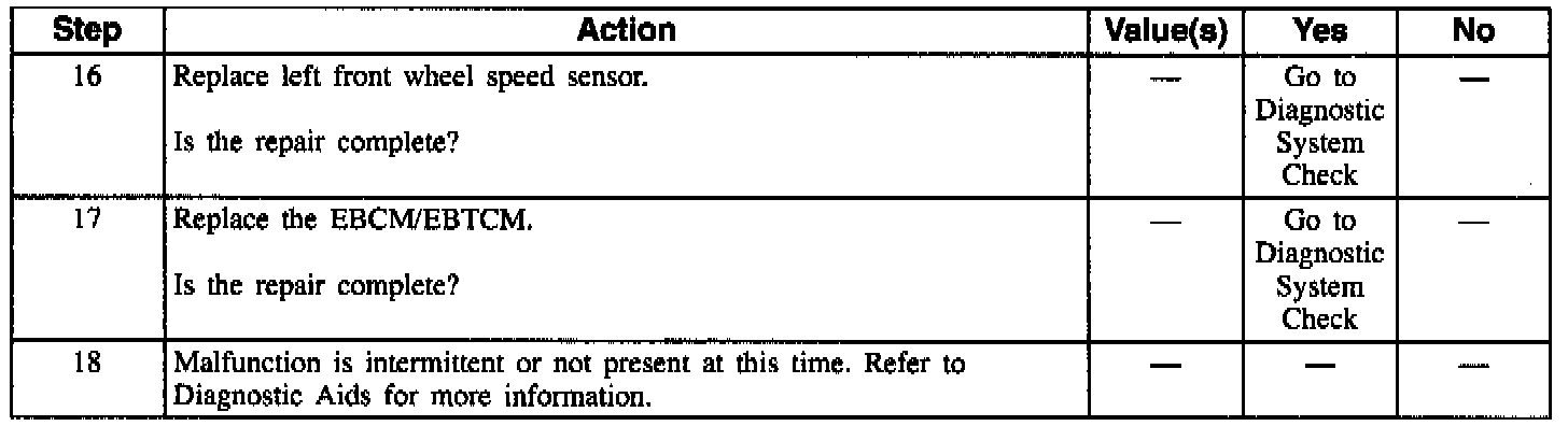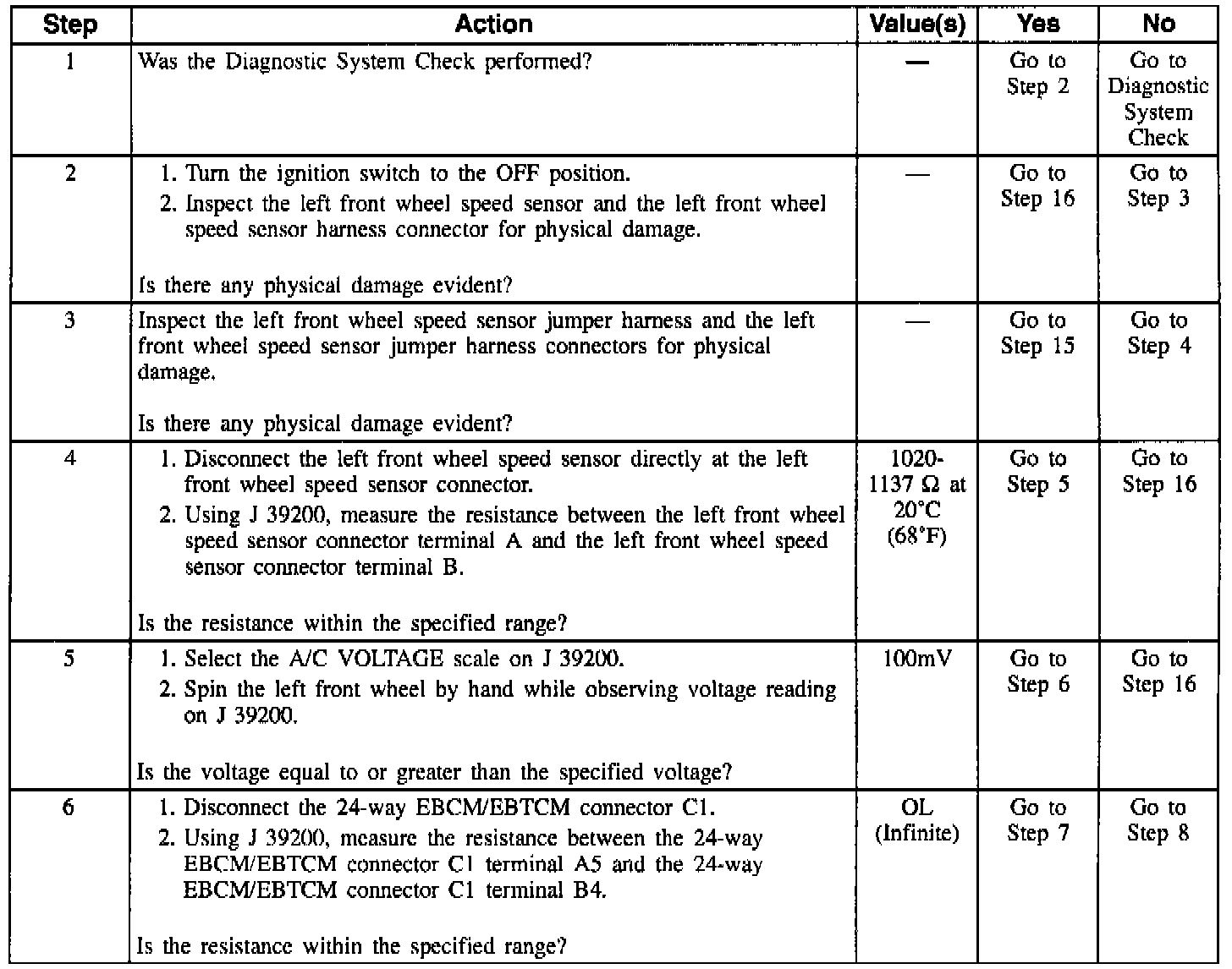 NOTE: Wheel speed sensor intermittent malfunctions may be difficult to locate. Care should be taken not to disturb any electrical connections prior to an indicated step of the diagnosis table. This will ensure that an intermittent condition will not be corrected before the source of the malfunction is found.