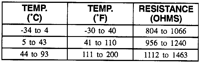 This table contains resistance values for the front wheel speed sensors at varying temperatures for use in diagnosis. The values are approximate and should be used as a guideline for diagnosis.