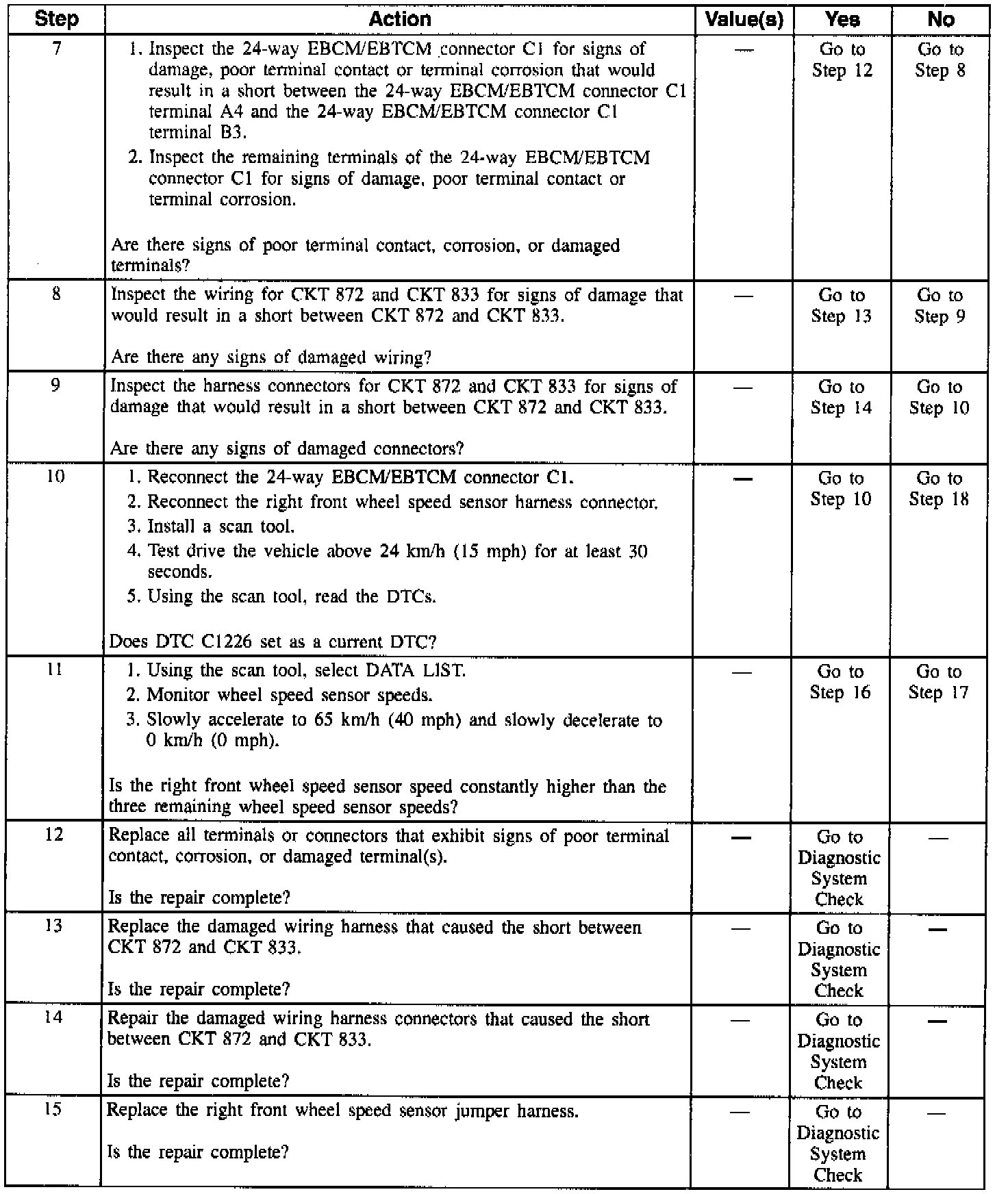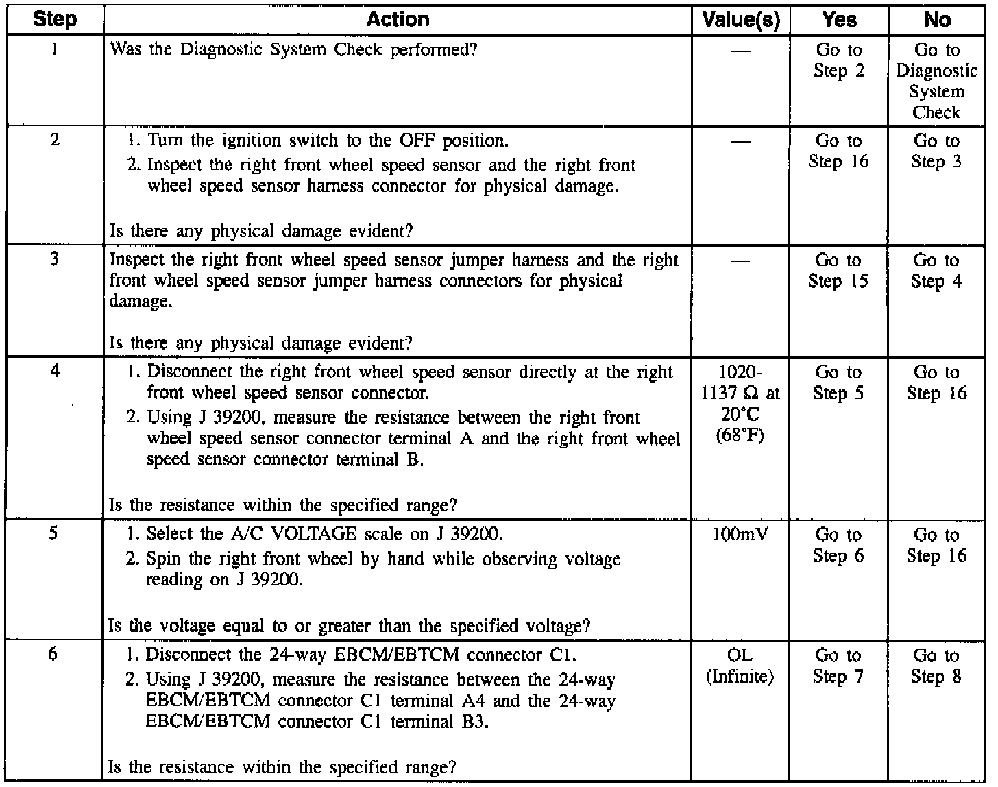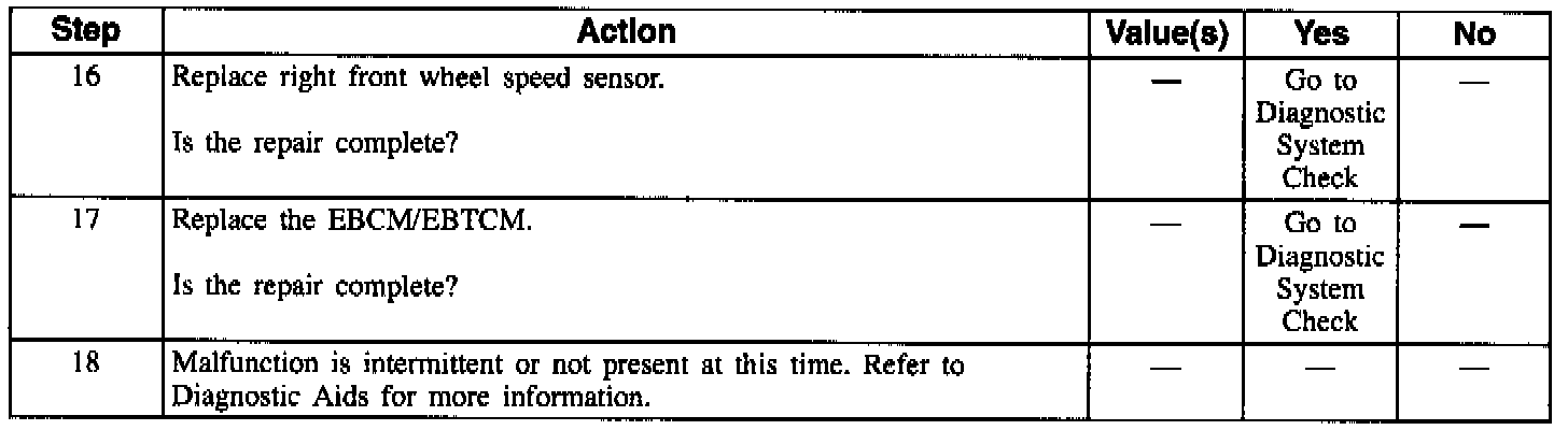 NOTE: Wheel speed sensor intermittent malfunctions may be difficult to locate. Care should be taken not to disturb any electrical connections prior to an indicated step of the diagnosis table. This will ensure that an intermittent condition will not be corrected before the source of the malfunction is found.