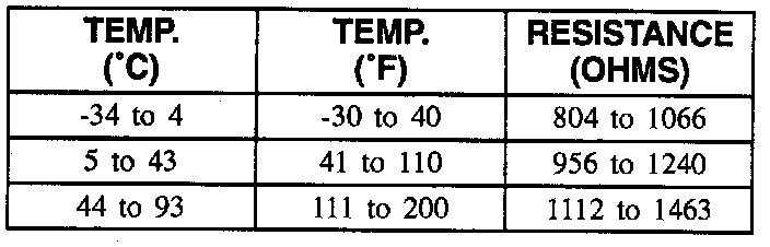 This table contains resistance values for the front wheel speed sensors at varying temperatures for use in diagnosis. The values are approximate and should be used as a guideline for diagnosis.