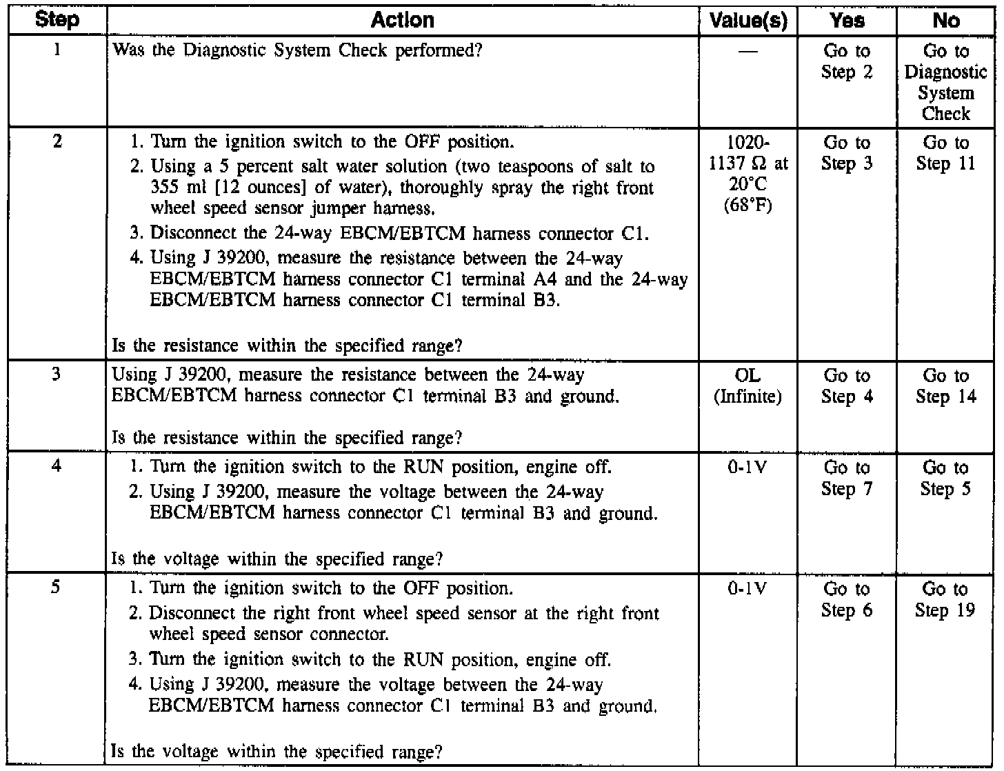 An intermittent malfunction may be caused by a poor connection, rubbed-through wire insulation, or a wire that is broken inside the insulation. The frequency of the malfunction can be checked by using the enhanced diagnostic function of the Scan Tool. If the customer's comments reflect that the amber ABS warning indicator is on only during moist environmental changes (rain, snow, vehicle wash), all wheel speed sensor circuitry should be thoroughly inspected for signs of water intrusion. If DTC is not current, clear DTCs and simulate the effects of water intrusion. Use the following procedure. Spray the suspected area with a 5 percent salt water solution (two teaspoons of salt to 355 ml [ 12 ounces] of water). Test drive vehicle over various road surfaces (bumps, turns, etc.) above 24 km/h (15 mph) for at least 30 seconds. If DTC returns, replace suspected harness. Any circuitry that is suspected of causing the intermittent complaint should be thoroughly checked for backed-out terminals, improper mating, broken locks, improperly formed or damaged terminals, poor terminal to wiring connections, or physical damage to the wiring harness. Resistance of the wheel speed sensor will increase with an increase in sensor temperature. When replacing a wheel speed sensor, inspect the sensor terminals and harness connector for corrosion and/or water intrusion. If evidence of corrosion or water intrusion exists, replace wheel speed sensor jumper harness. Likewise, if replacing a wheel speed sensor jumper harness, inspect sensor terminals. If evidence of corrosion or water intrusion exists, replace wheel speed sensor.
