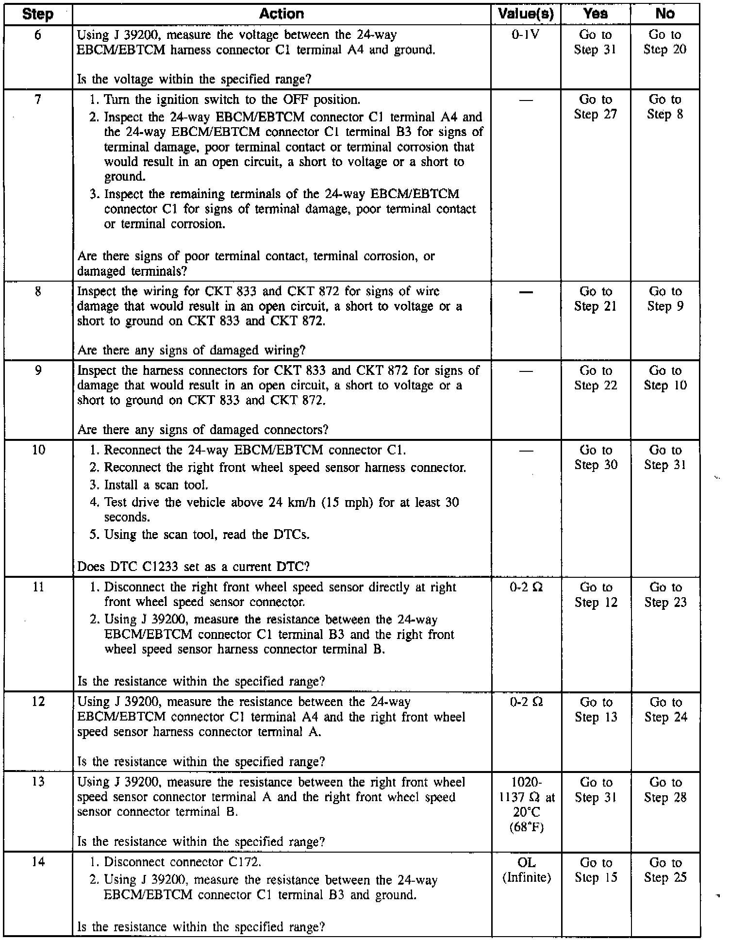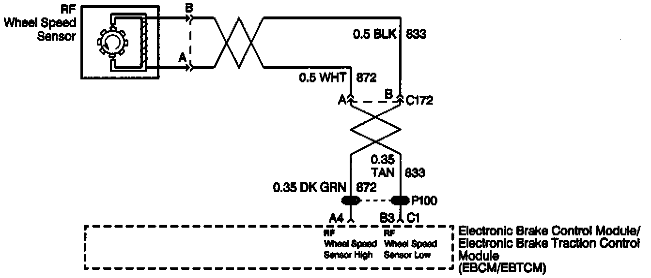 DTC C1233 can be set anytime after initialization. If either of the right front wheel speed sensor circuits are open or shorted to voltage or ground, a malfunction exists.