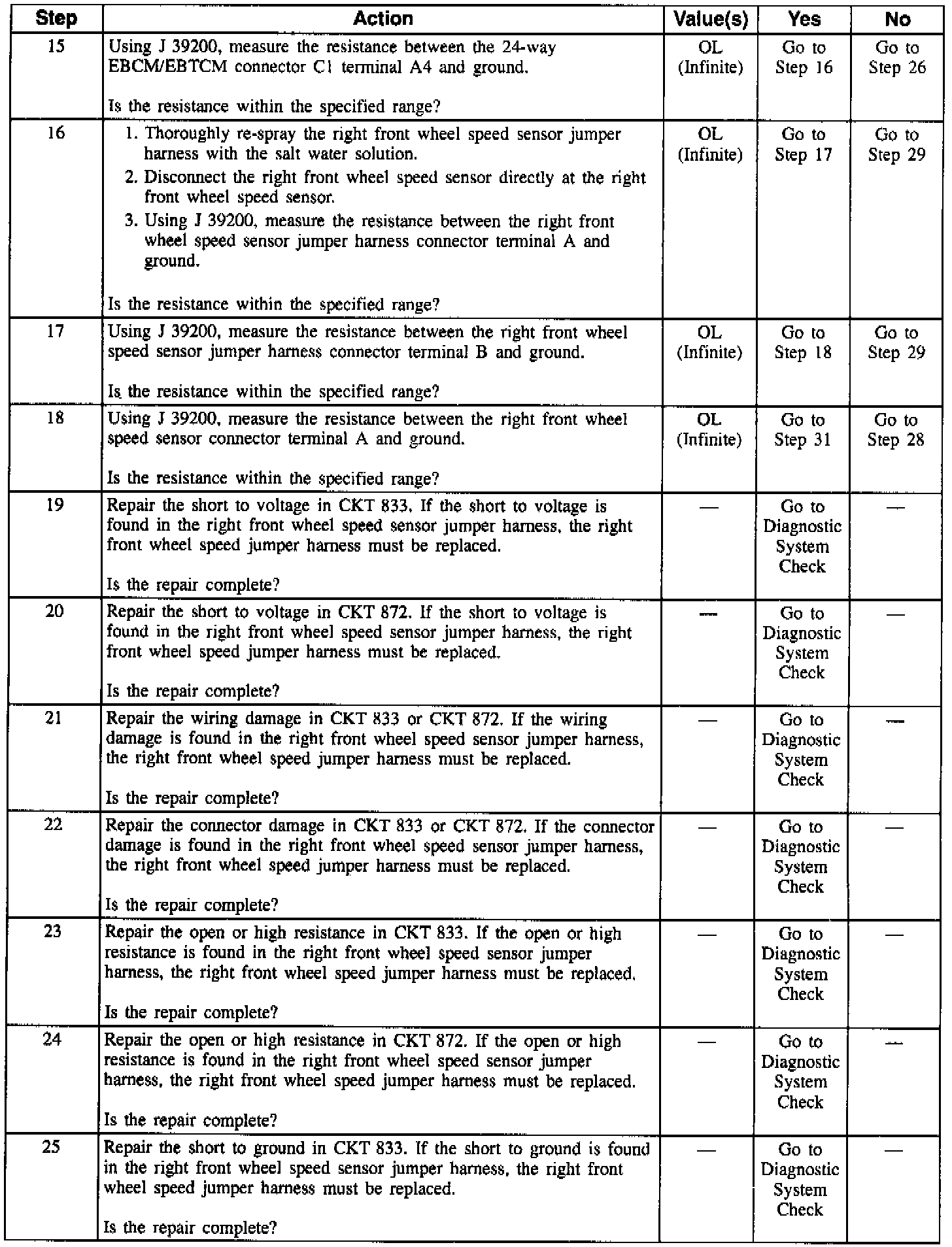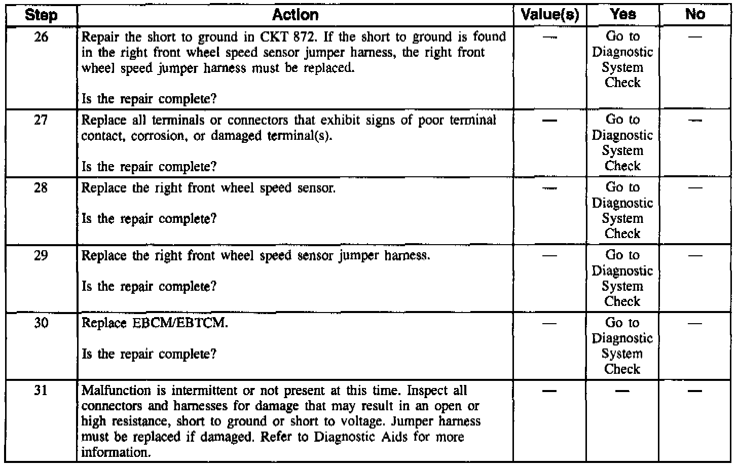 NOTE: Wheel speed sensor intermittent malfunctions may be difficult to locate. Care should be taken not to disturb any electrical connections prior to an indicated step of the diagnosis table. This will ensure that an intermittent condition will not be corrected before the source of the malfunction is found.