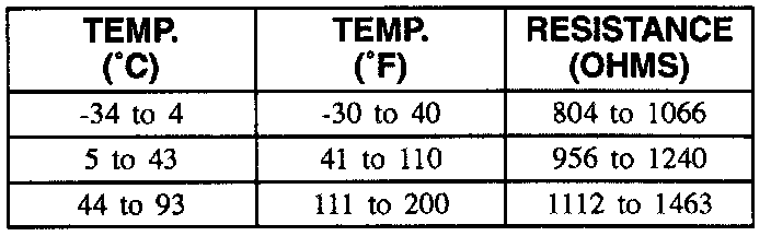 This table contains resistance values for the front wheel speed sensors at varying temperatures for use in diagnosis. The values are approximate and should be used as a guideline for diagnosis.
