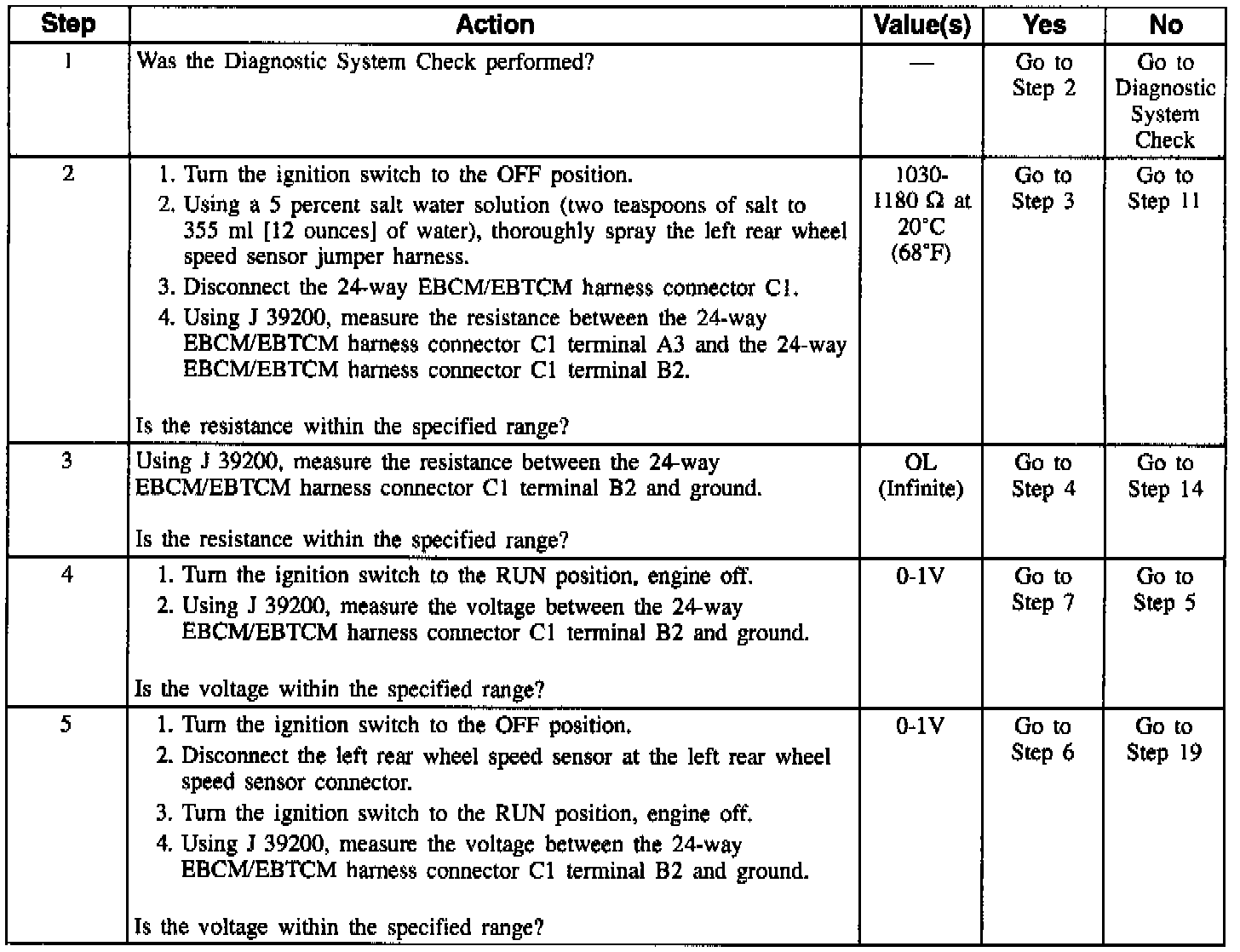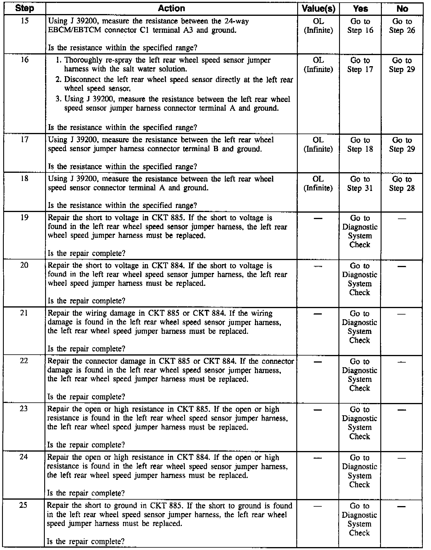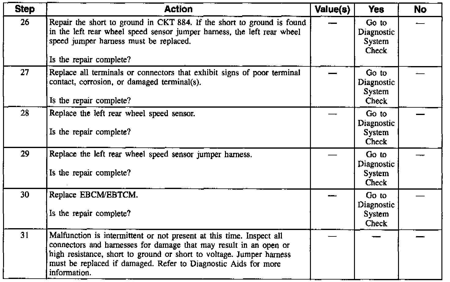 NOTE: Wheel speed sensor intermittent malfunctions may be difficult to locate. Care should be taken not to disturb any electrical connections prior to an indicated step of the diagnosis table. This will ensure that an intermittent condition will not be corrected before the source of the malfunction is found.