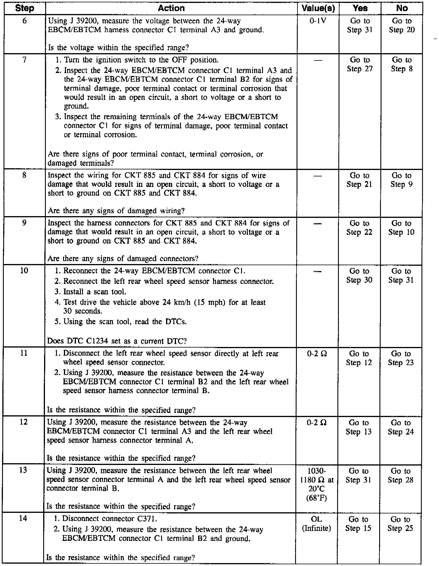 DTC C1234 can be set anytime after initialization. If either of the left rear wheel speed sensor circuits are open or shorted to voltage or ground, a malfunction exists.