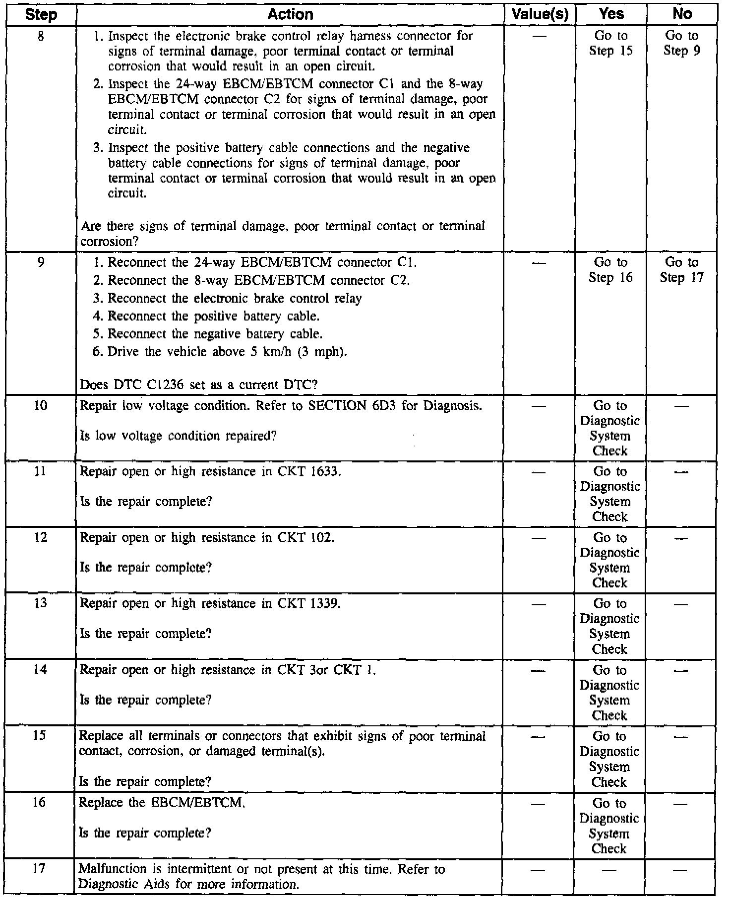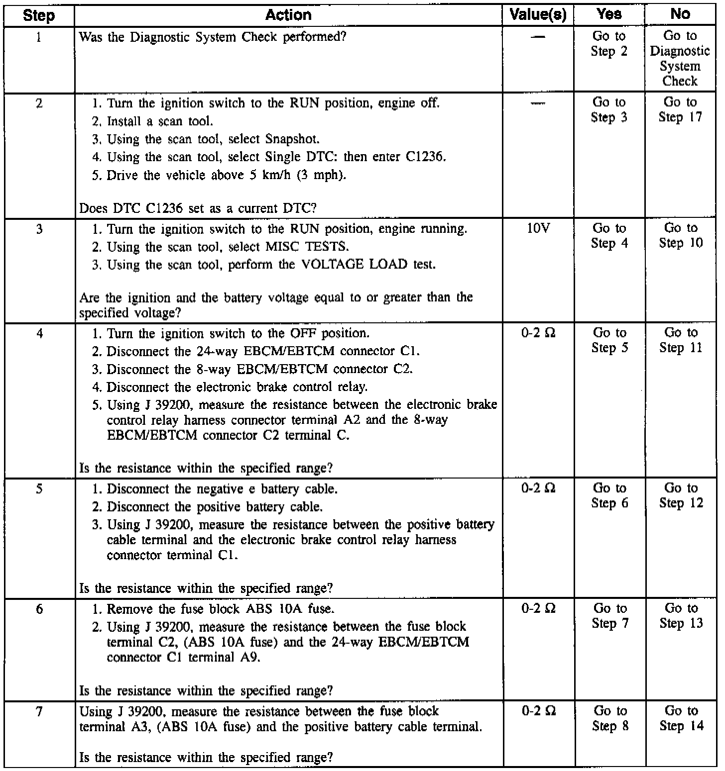 DTC C1236 can only be set if the vehicle's speed is greater than 5 km/h (3 mph). If the switched battery voltage is less than 11.4 volts non-ABS event or less than 8.4 volts during a ABS event, a malfunction exists.