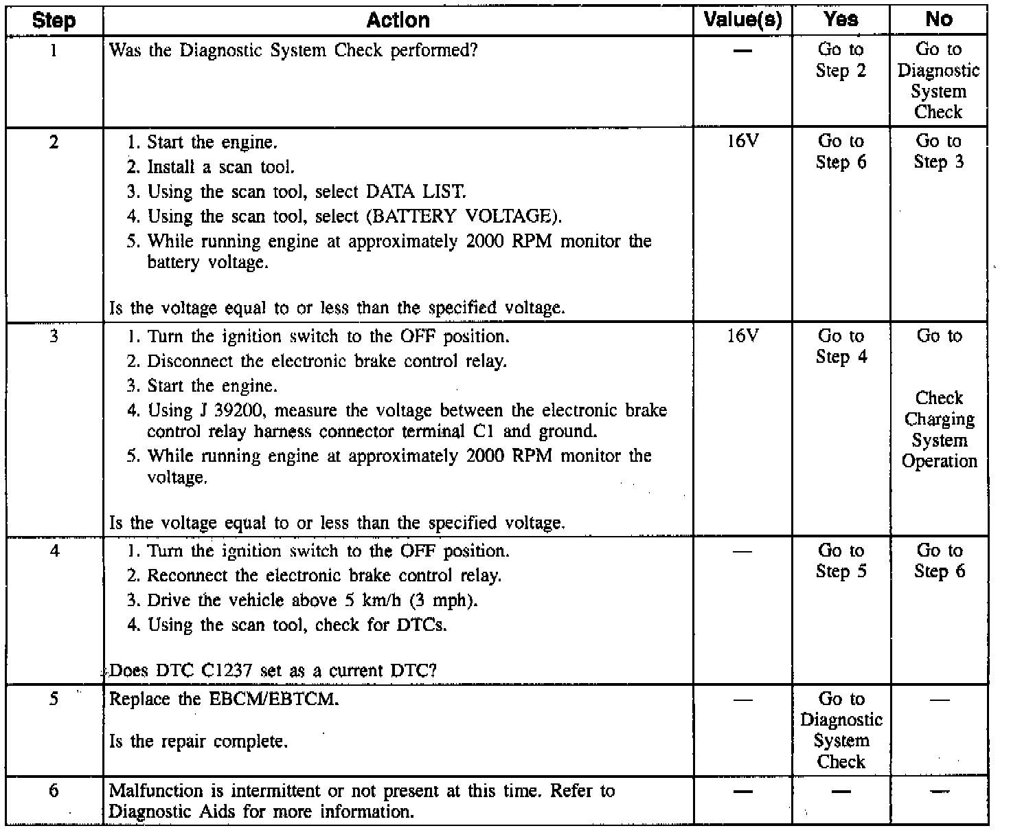 DTC C1237 can only be set if the vehicle's speed is greater than 5 km/h (3 mph). If the switched battery voltage is greater than 17.1 volts, a malfunction exists.
