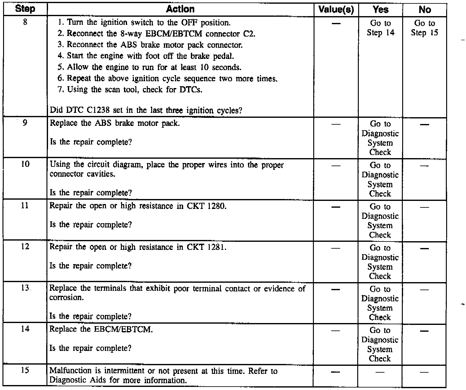 DTC C1238 can be set during brake motor initialization at 0 km/h (0 mph) with the brake off. DTC C1238 can also be set during brake motor initialization at 5 km/h (3 mph) with the brake on. If the EBCM/EBTCM detects that the ESB could not hold the piston in the home position, a malfunction exists. DTC C1286 is always set with DTC C1238.