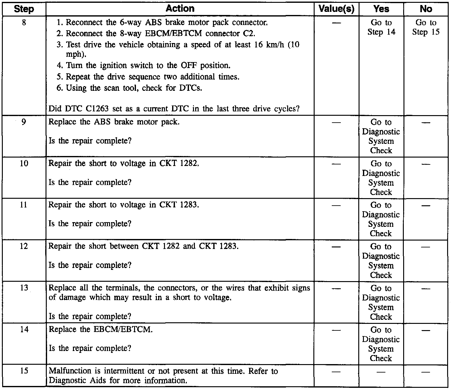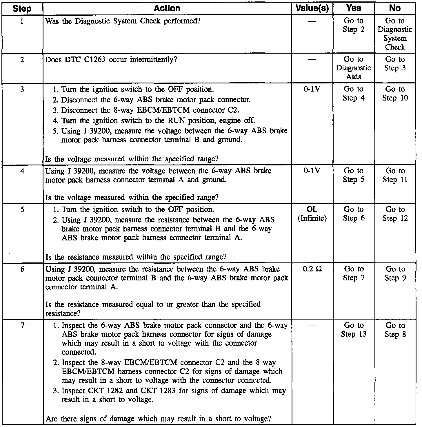 DTC C1263 can be set only when the ABS motor is commanded off. If the EBCM/EBTCM detects an out of range voltage on either of the right front ABS motor circuits indicating a circuit shorted to voltage or an ABS motor shorted, a malfunction exists.