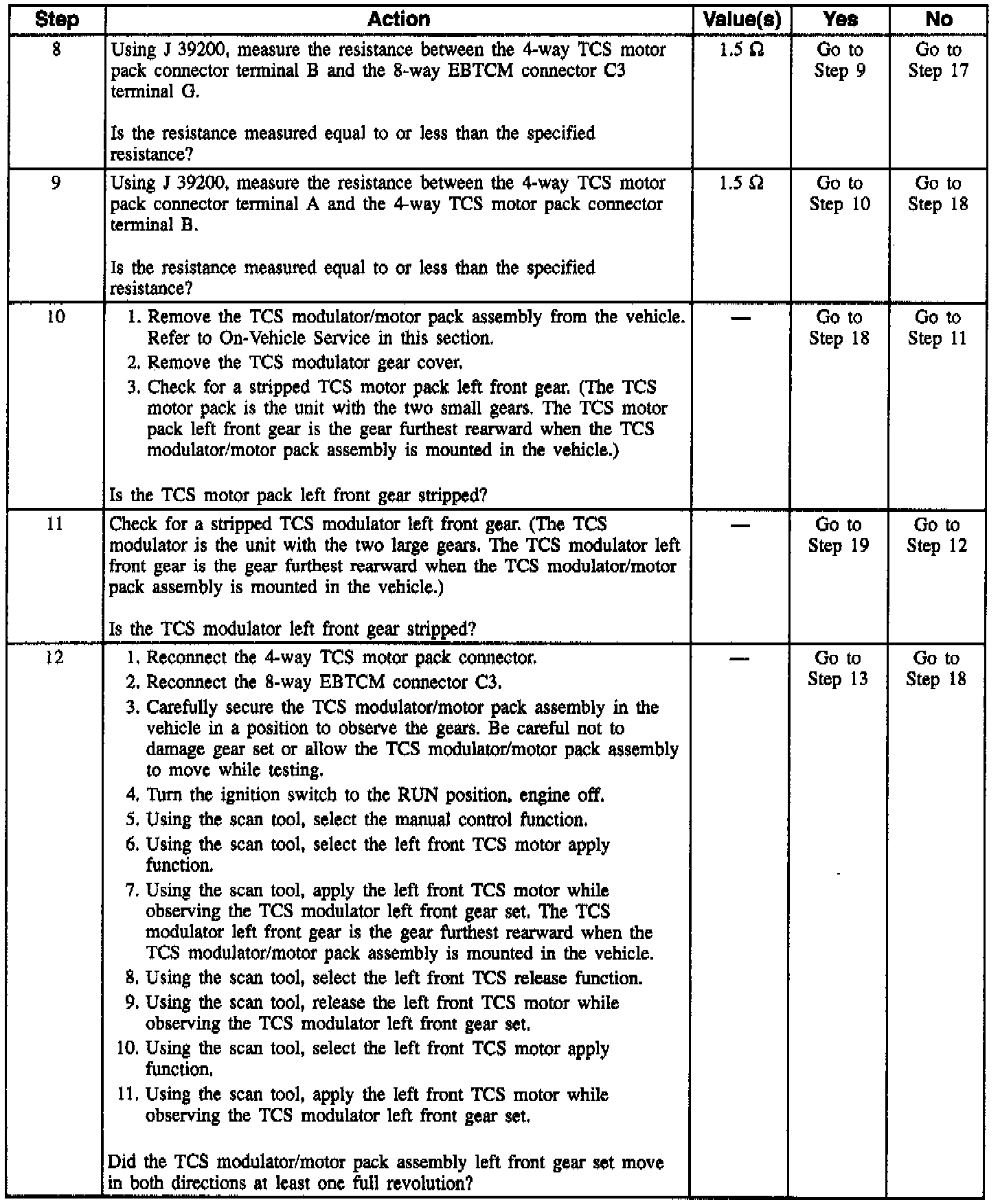 This DTC is designed to detect a stripped nut or gear assembly during initialization. During the homing sequence, the piston should reach the bottom of the bore resulting in a stalled Traction Control System (TCS) motor. If this does not occur, the TCS motor must be spinning with little or no resistance, indicating a nut/screw or gear malfunction.