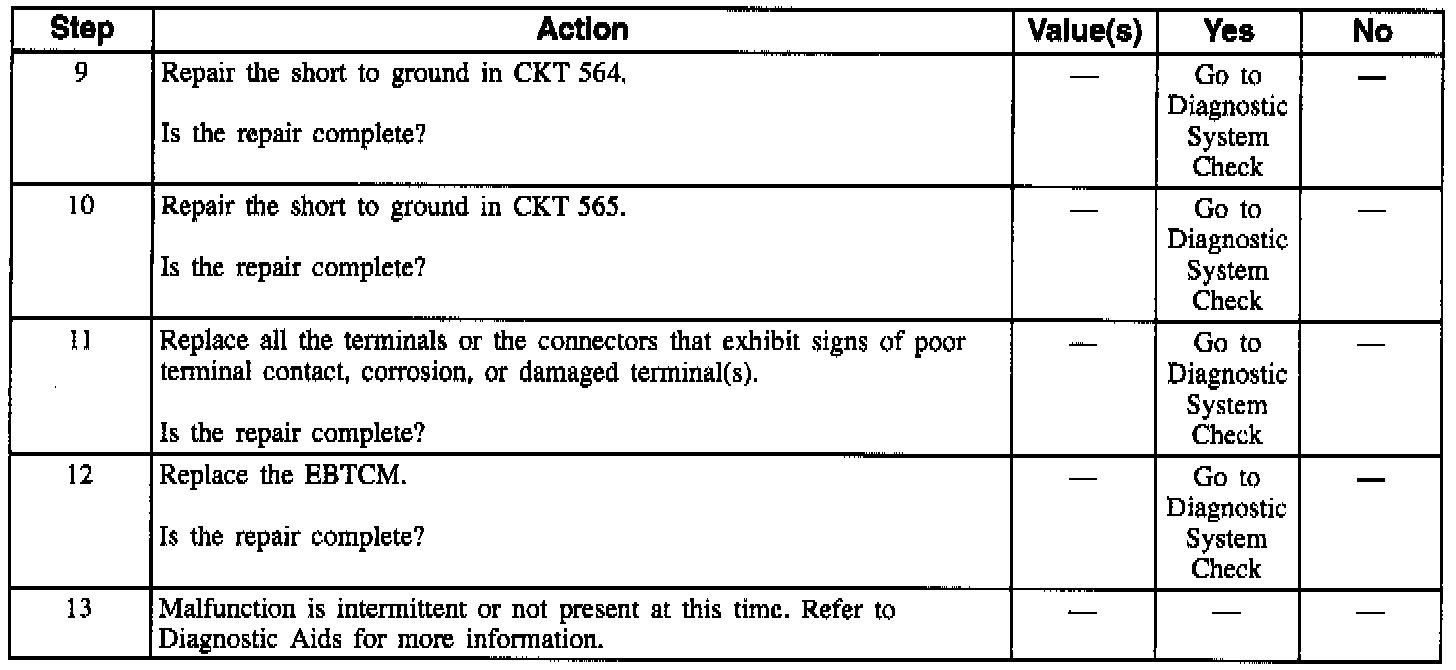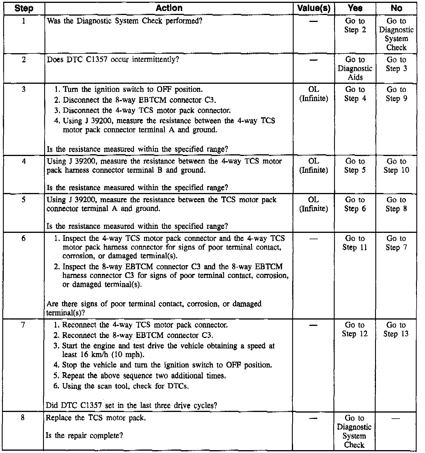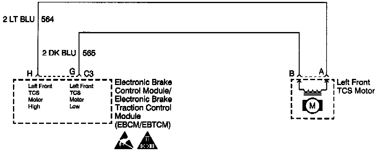 DTC C1357 can be set anytime. If the Electronic Brake Traction Control Module (EBTCM) detects an out of range voltage on either of the left front TCS motor circuits indicating a circuit shorted to ground, a malfunction exists.