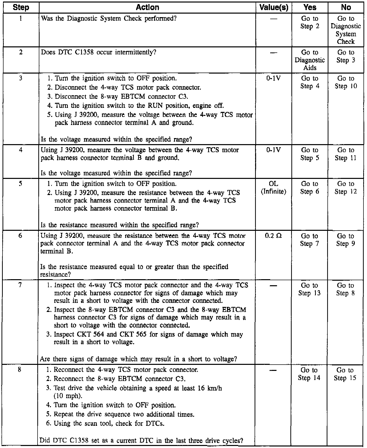 DTC C1358 can be set only when the TCS motor is commanded off. If the Electronic Brake Traction Control Module (EBTCM) detects an out of range voltage on either of the left front TCS motor circuits indicating a circuit shorted to voltage or a TCS motor shorted, a malfunction exists.