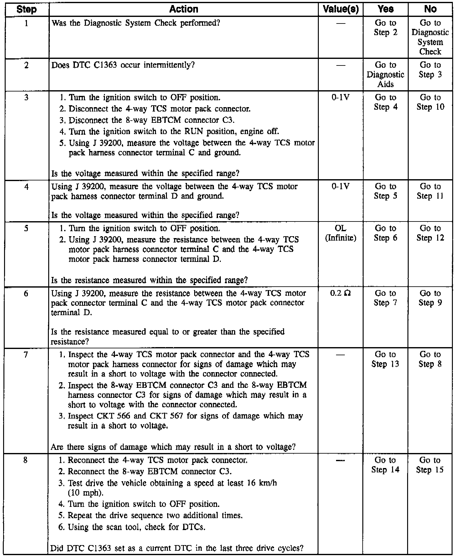DTC C1363 can be set only when the TCS motor is commanded off. If the Electronic Brake Traction Control Module (EBTCM) detects an out of range voltage on either of the right front TCS motor circuits indicating a circuit shorted to voltage or a TCS motor shorted, a malfunction exists.