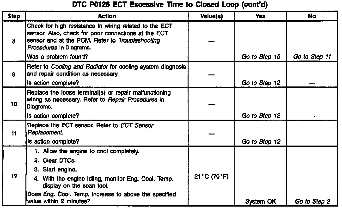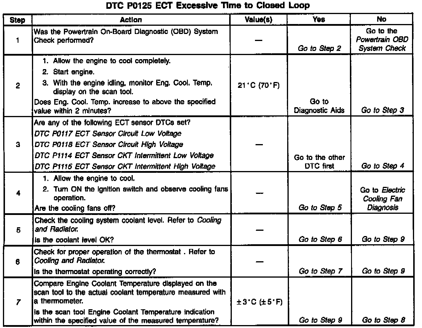 ^ DTC P0125 set indicates a skewed ECT sensor. Comparing the engine coolant temperature displayed on a scan tool with actual coolant temperature measured with a thermometer may isolate this condition. If the displayed engine coolant temperature is not close to the actual coolant temperature, replace the ECT sensor. Refer to Temperature vs Resistance table.