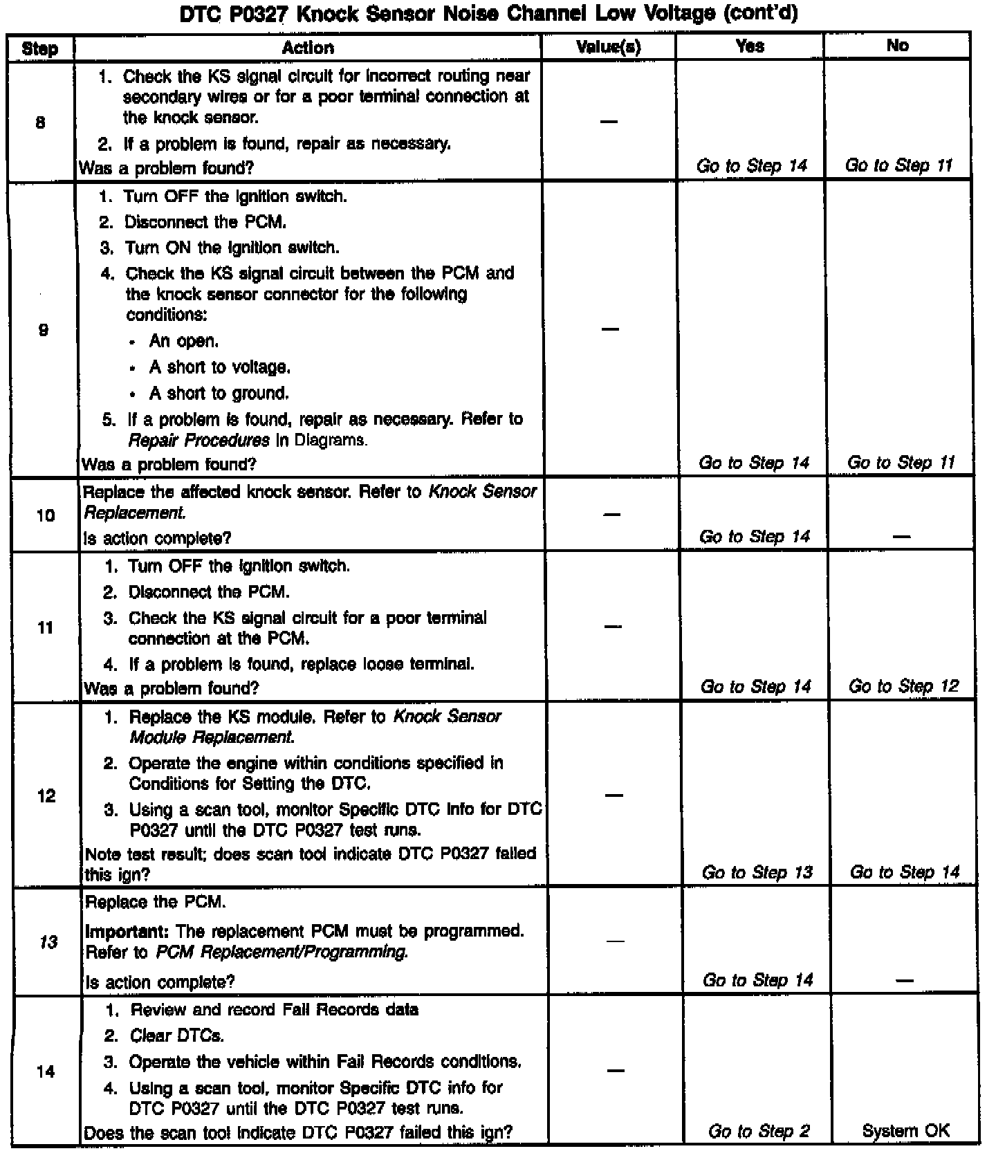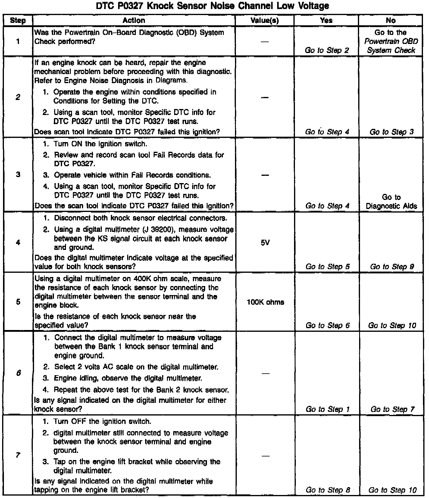 The PCM determines whether the knock sensors and related wiring are operating properly by monitoring the voltage level on the noise channel. The noise channel allows the PCM to diagnose the KS system by allowing the PCM to learn the amount of normal engine mechanical noise present. Normal engine noise varies depending on engine speed and load. When the PCM determines that an abnormally low noise channel voltage level is being experienced, a DTC P0327 will set.