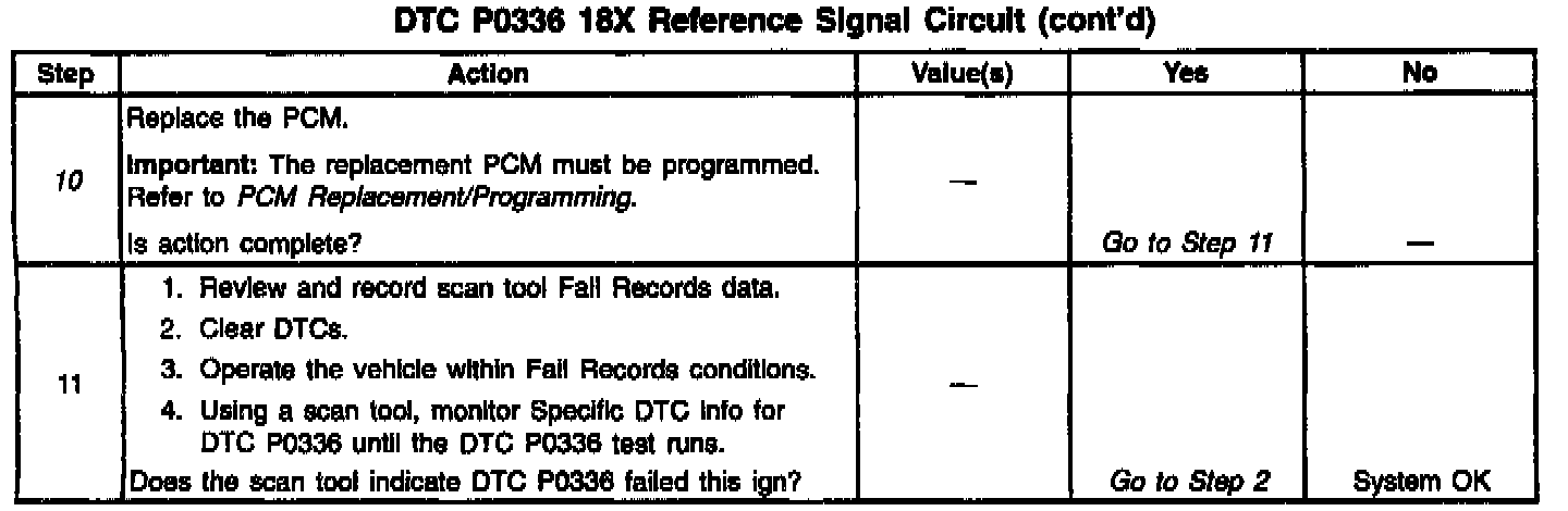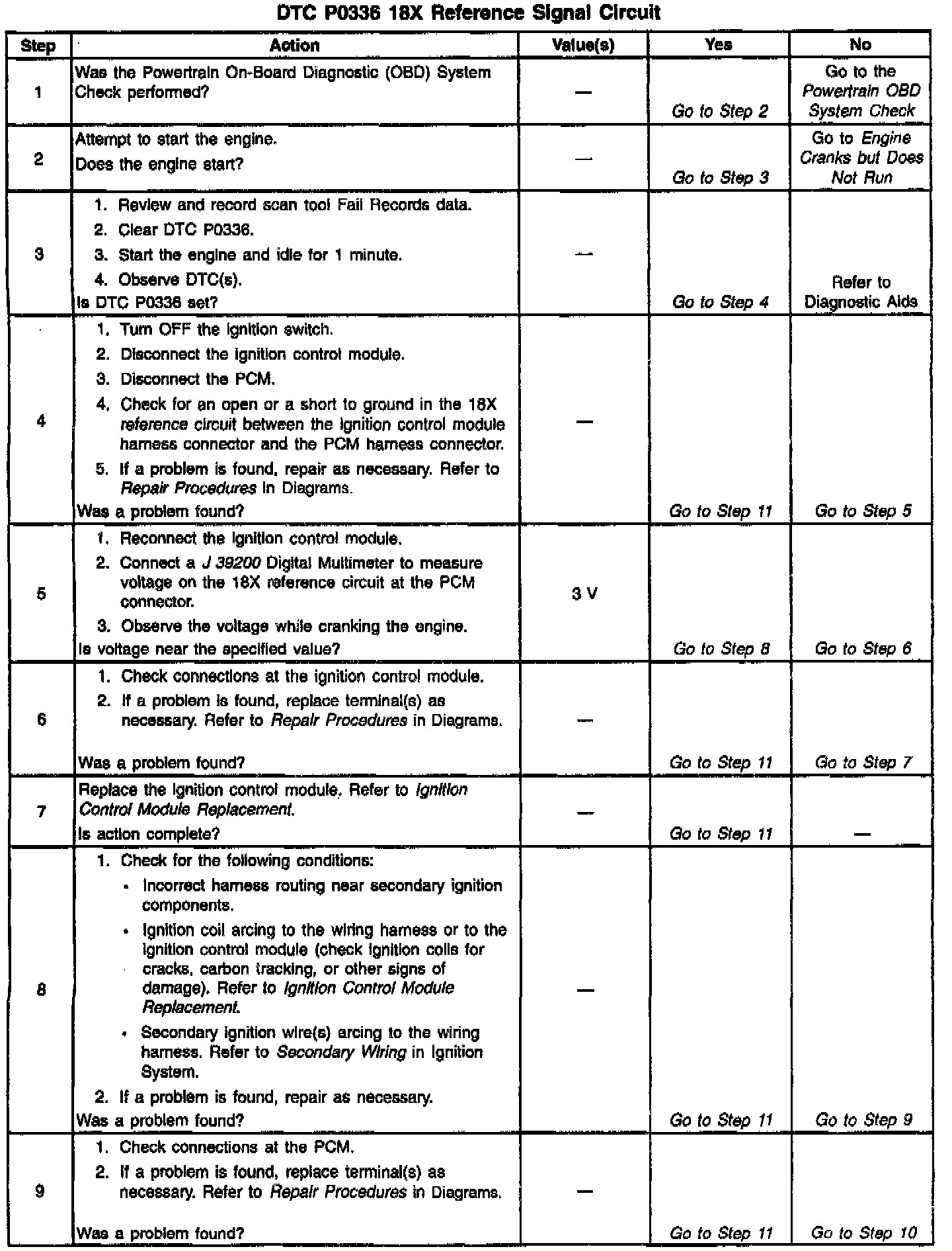 The 18X reference signal is produced by the ignition control module. The ICM calculates the 18X reference signal by filtering the Crankshaft Position (CKP) sensor lax pulses when the engine is running and CKP sync pulses are also being received. The PCM uses the 18X reference signal to calculate engine RPM and crankshaft position at engine speeds below 1200 RPM. The PCM constantly monitors the number of pulses on the 18X reference circuit and compares the number of 18X reference pulses to the number of 3X reference pulses and CAM signal pulses being received. If the PCM receives an incorrect number of pulses on the 18X reference circuit, DTC P0336 will set and the PCM will use the 3X reference signal circuit for fuel and ignition control. The engine will continue to start and run using the 3X reference and CAM signals only.