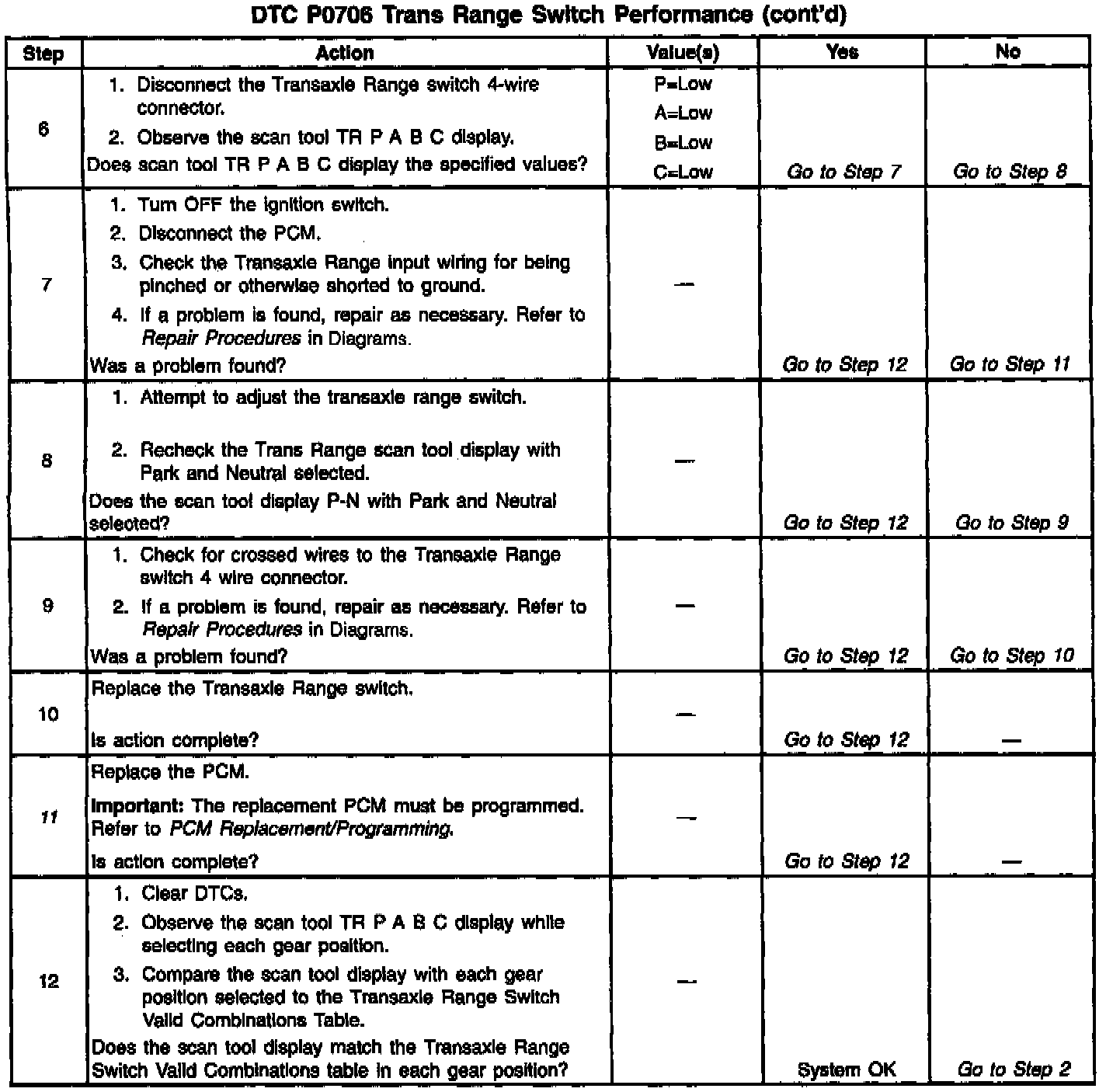 A problem with the transaxle range switch adjustment which causes the PCM to detect vehicle start-up while a gear position other than Park or Neutral is selected will set DTC P0706.