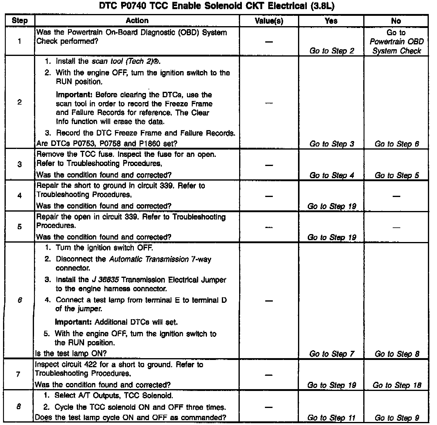When the PCM detects low voltage when the TCC Sol. Valve is commanded OFF or high voltage when the TCC Sol.. Valve is commanded ON, then DTC P0740 sets. DTC P0740 is a type A DTC.