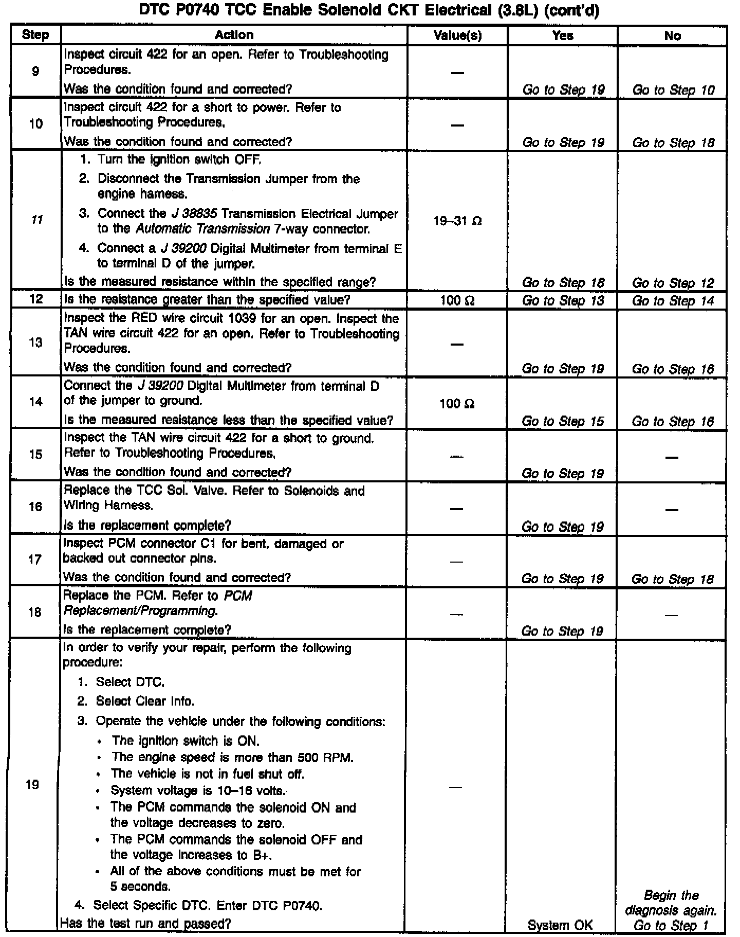 11. This step verifies that the TCC Sol. Valve is not shorted across its windings or increased its resistance.