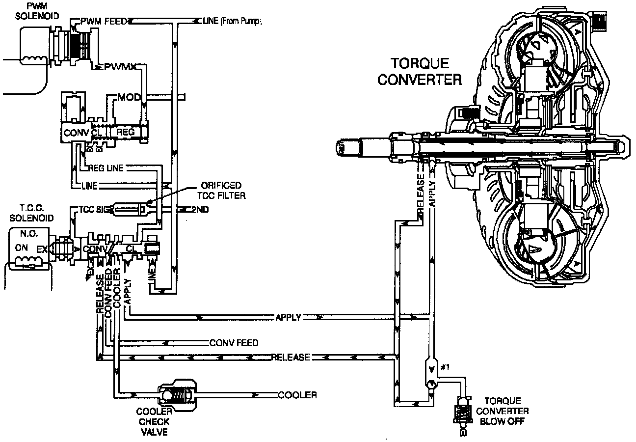 The Torque Converter Clutch Solenoid Valve (TCC Sol Valve) acts on the hydraulic fluid, controlling TCC apply and release.