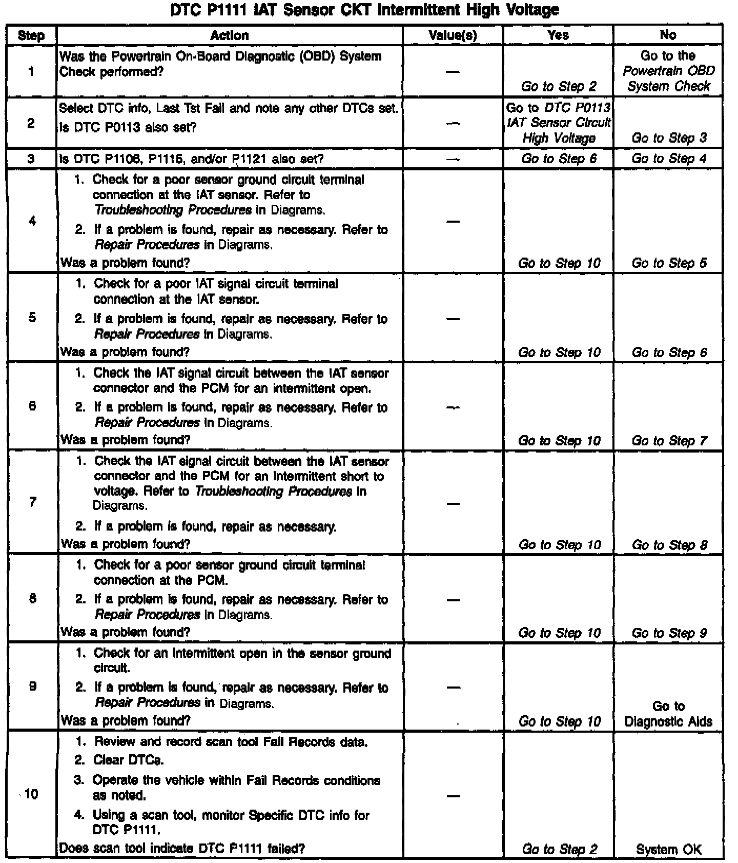 The Intake Air Temperature (IAT) sensor is a thermistor which measures the temperature of the air entering the engine. The PCM applies 5 volts through a pull-up resistor to the IAT sensor. When the intake air is cold, the sensor resistance is high and the PCM will monitor a high signal voltage on the IAT signal circuit. If the intake air is warm, the sensor resistance is lower causing the PCM to monitor a lower voltage. DTC P1111 will set when the PCM detects an intermittently high signal voltage on the intake air temperature sensor signal circuit.