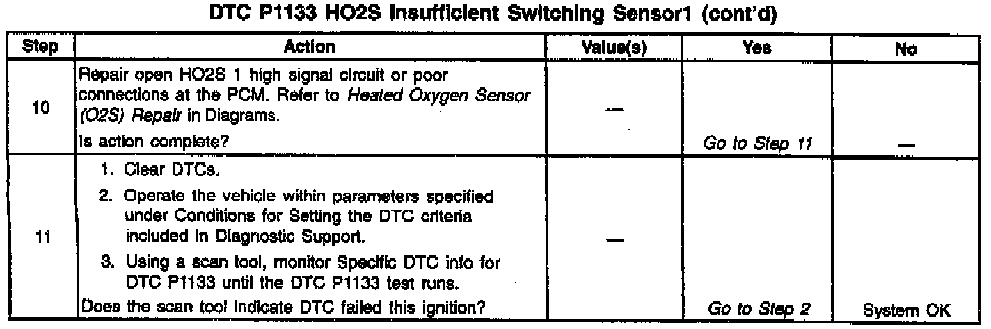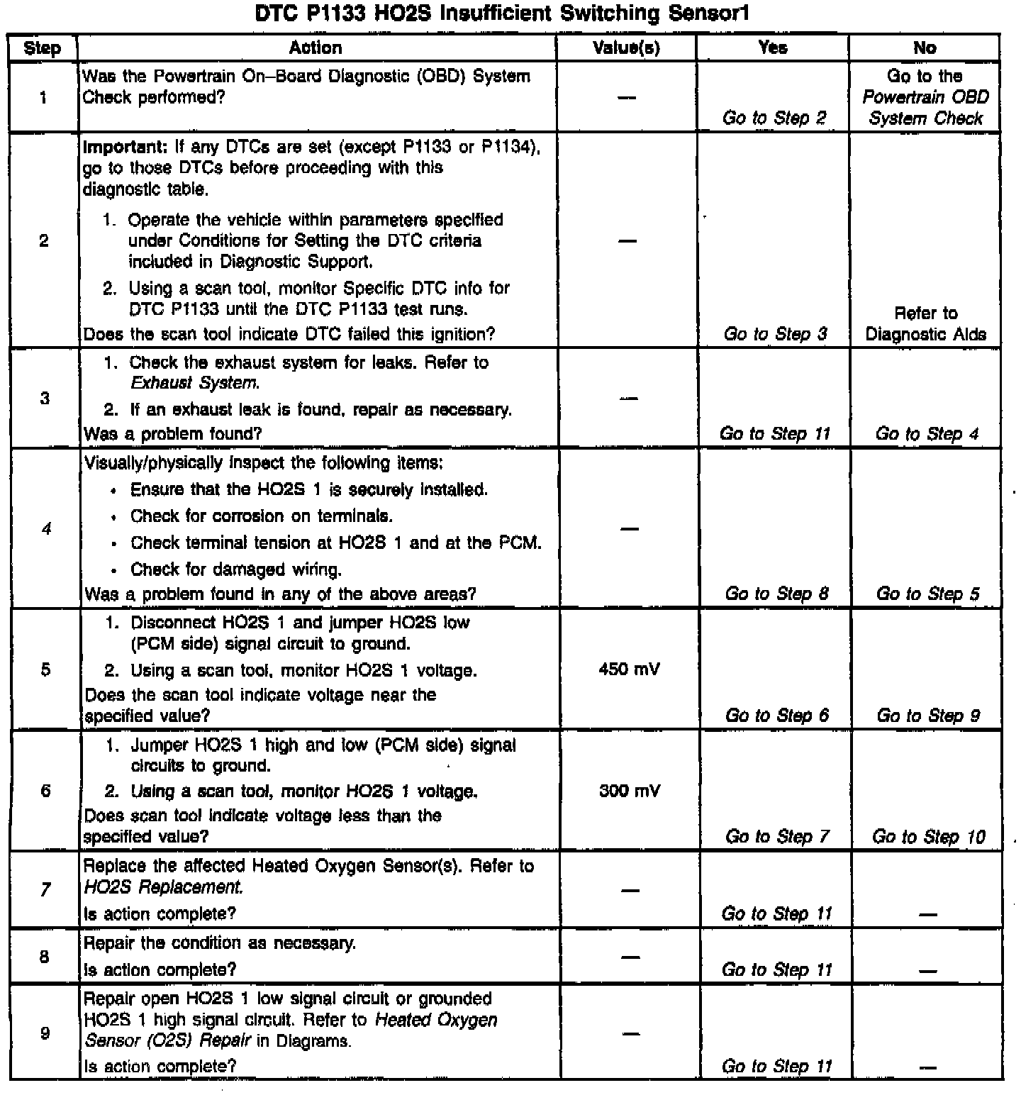 The PCM monitors the Heated Oxygen Sensor (HO2S) activity for 100 seconds. During this test period the PCM counts the number of times that the HO2S signal voltage crosses the rich to lean and lean to rich thresholds. if the PCM determines that the HO2S did not switch enough times, DTC P1133 will be set. A lean to rich switch is determined when the HO2S voltage changes from less than 300 mV to greater than 600 mV. A rich to lean switch is determined when the HO2S voltage changes from more than 600 mV to less than 300 mV.