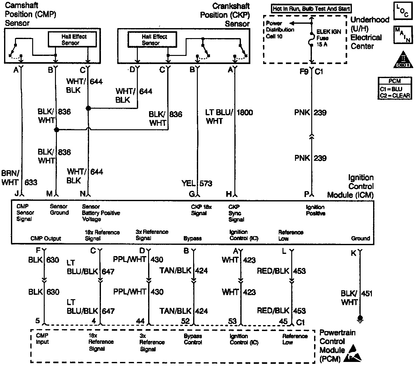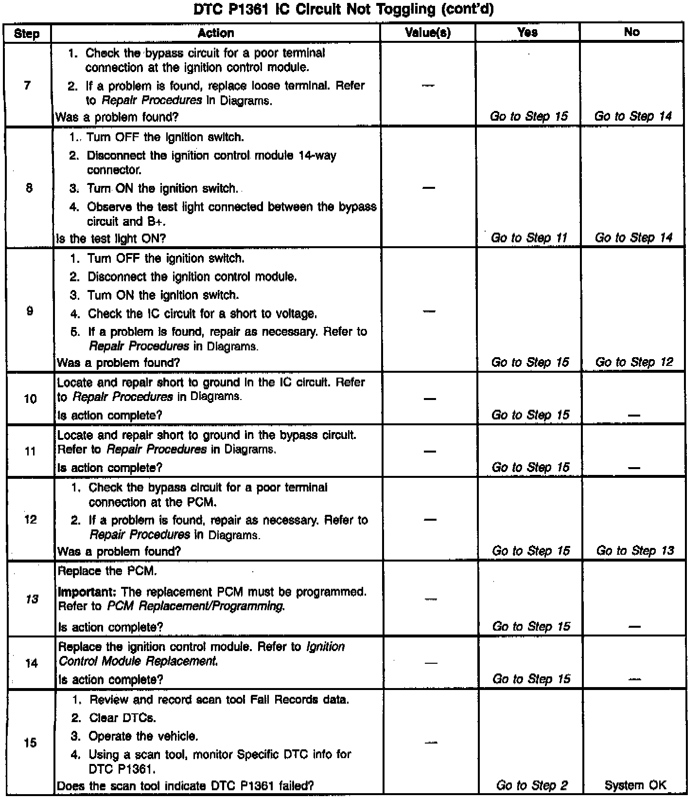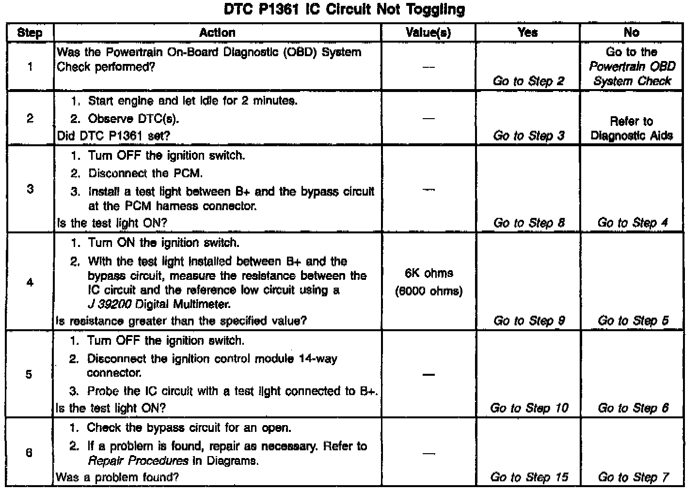 The Ignition Control Module (ICM) sends signals that the PCM requires for fuel control and spark advance calculations. At the start of engine crank, the CM controls spark advance (Bypass mode). When the second 3X reference pulse is recognized by the PCM, the PCM applies 5 volts to the Bypass circuit. The 5 volts on the Bypass circuit commands the ICM to switch spark advance to PCM control (IC mode). At this time, The ICM will remove the ground it has applied to the IC circuit. When the IC pulses are not grounded, the ICM can use the IC pulses to control spark advance. A short in the IC circuit or an open or short to ground in the Bypass circuit will cause the PCM to monitor no IC pulses after the PCM has switched the Bypass circuit ON. The PCM will set DTC P1361 under either of these conditions. The engine may be started but will run on Bypass mode timing.
