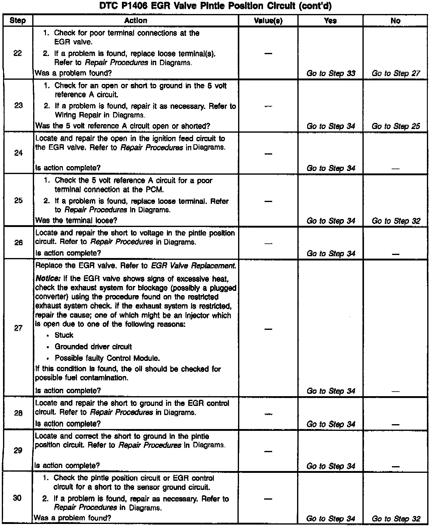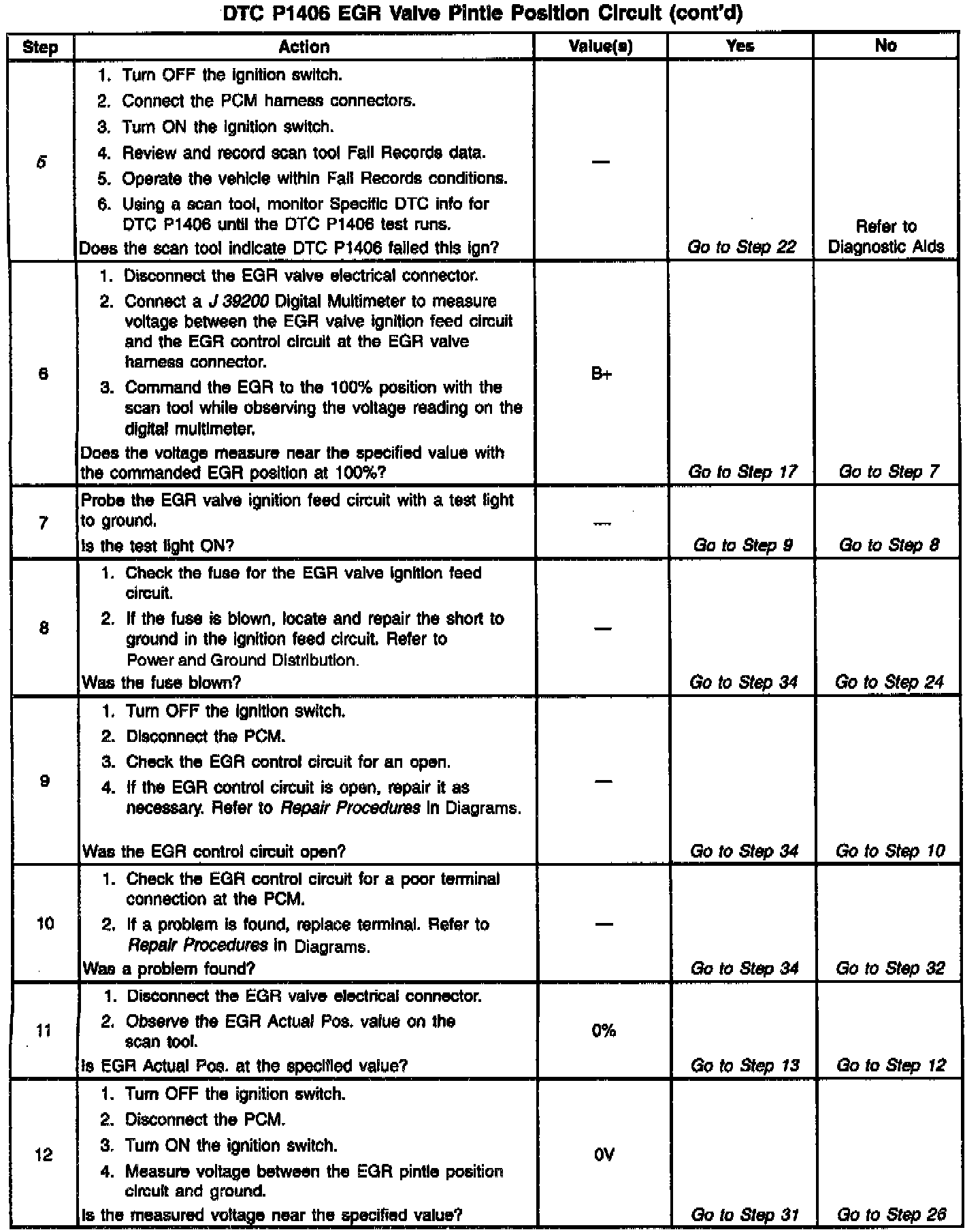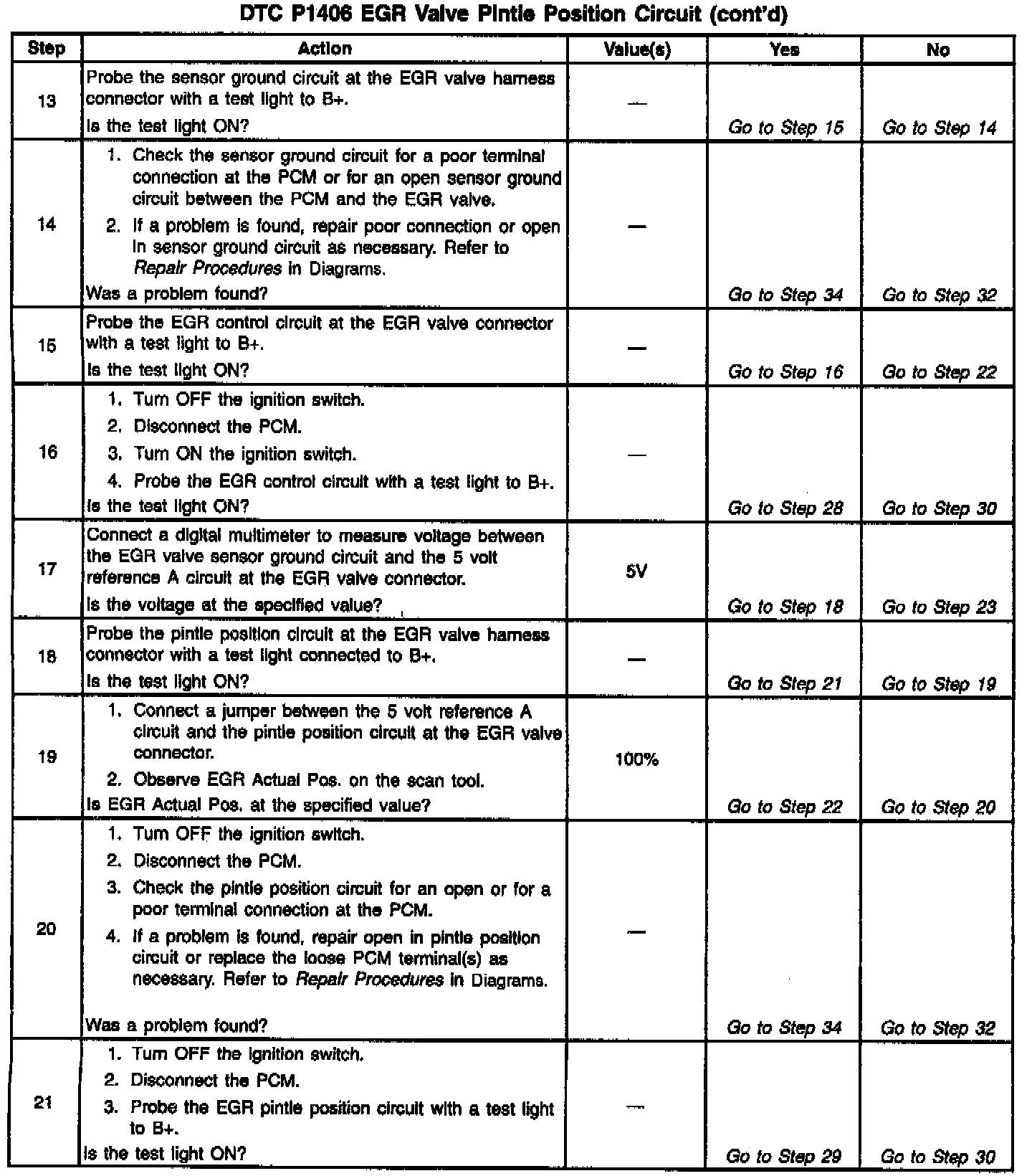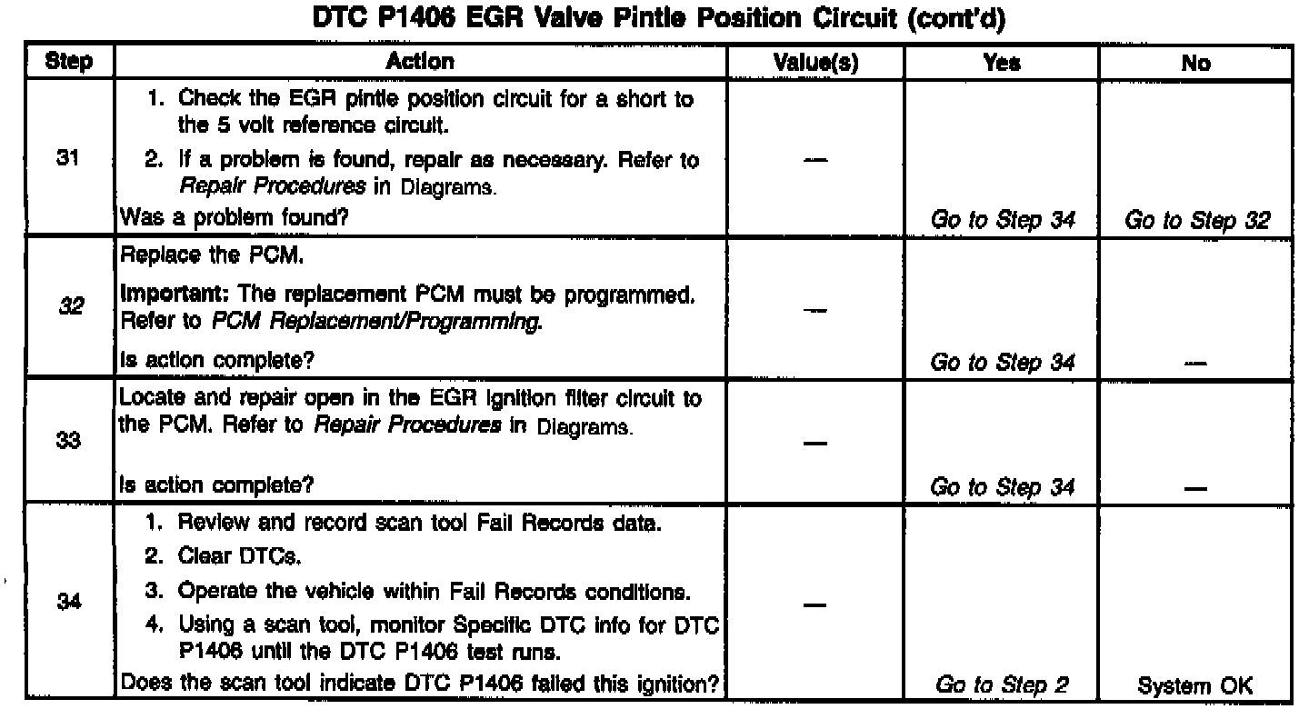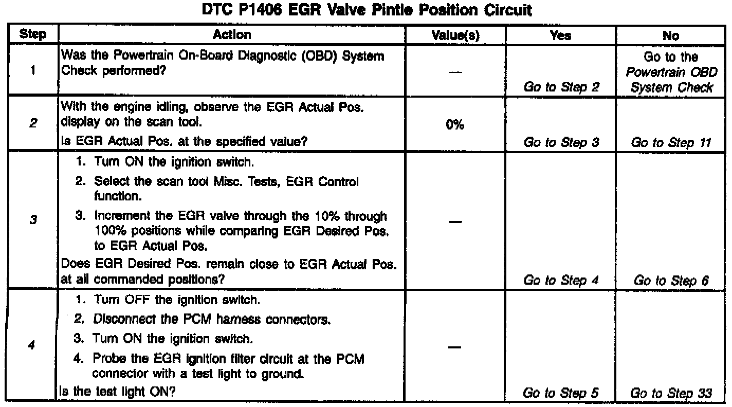 The PCM monitors the EGR valve pintle position input to ensure that the valve responds properly to commands from the PCM and to detect a malfunction if the pintle position sensor and control circuits are open or shorted. If the PCM detects a pintle position signal voltage outside the normal range of the pintle position sensor, or a signal voltage that is not within a tolerance considered acceptable for proper EGR system operation, the PCM will set DTC P1406.