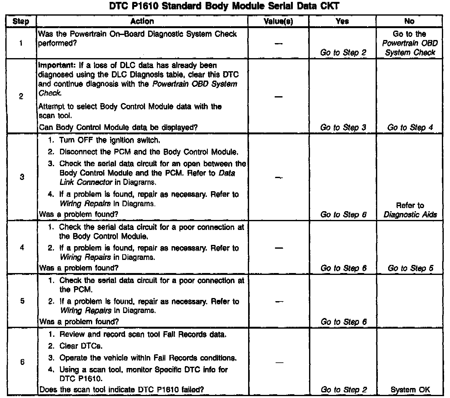The PCM uses the serial data circuit to communicate with various other devices and systems in the vehicle. The PCM ensures that communication remains established by monitoring the serial data circuit for state of health messages from the other devices using the circuit. If the PCM detects a loss of the state of health serial data message from the Standard Body Module, DTC P1610 will be set.