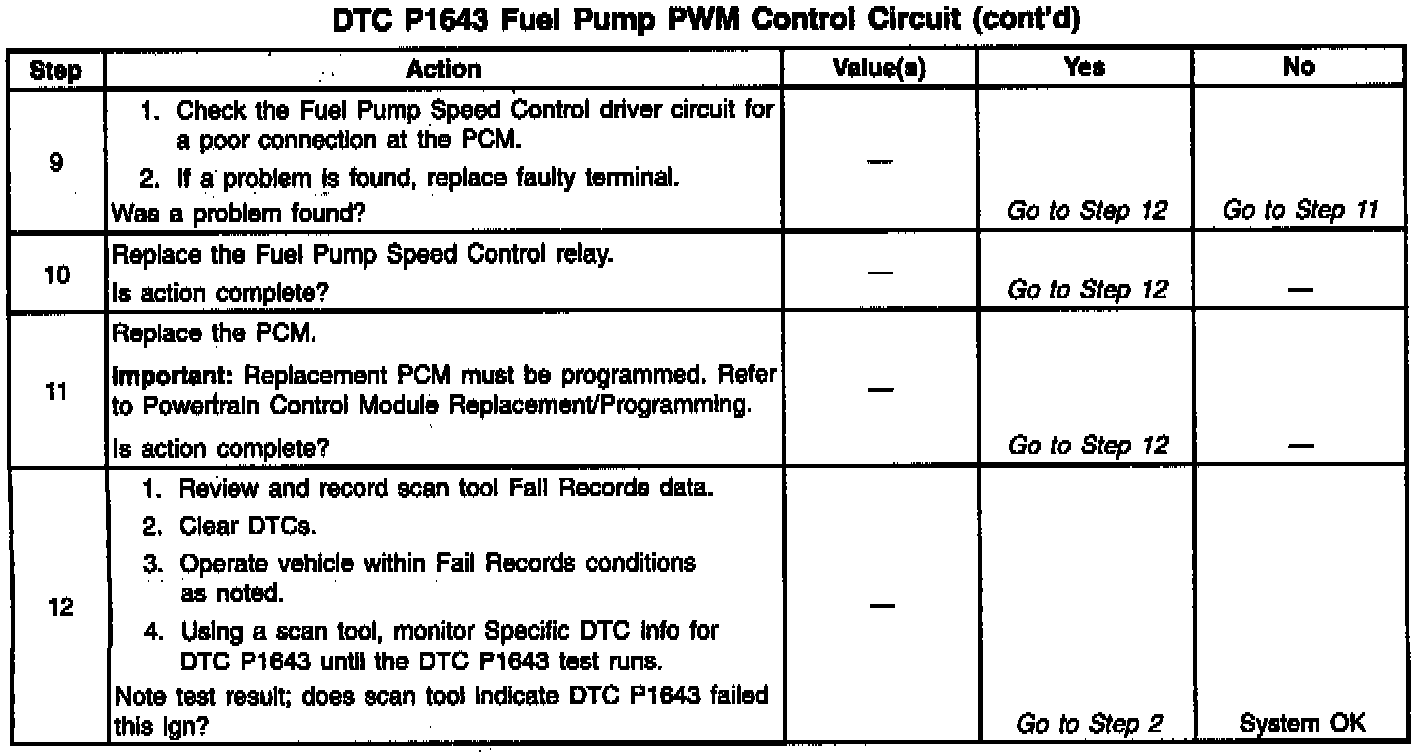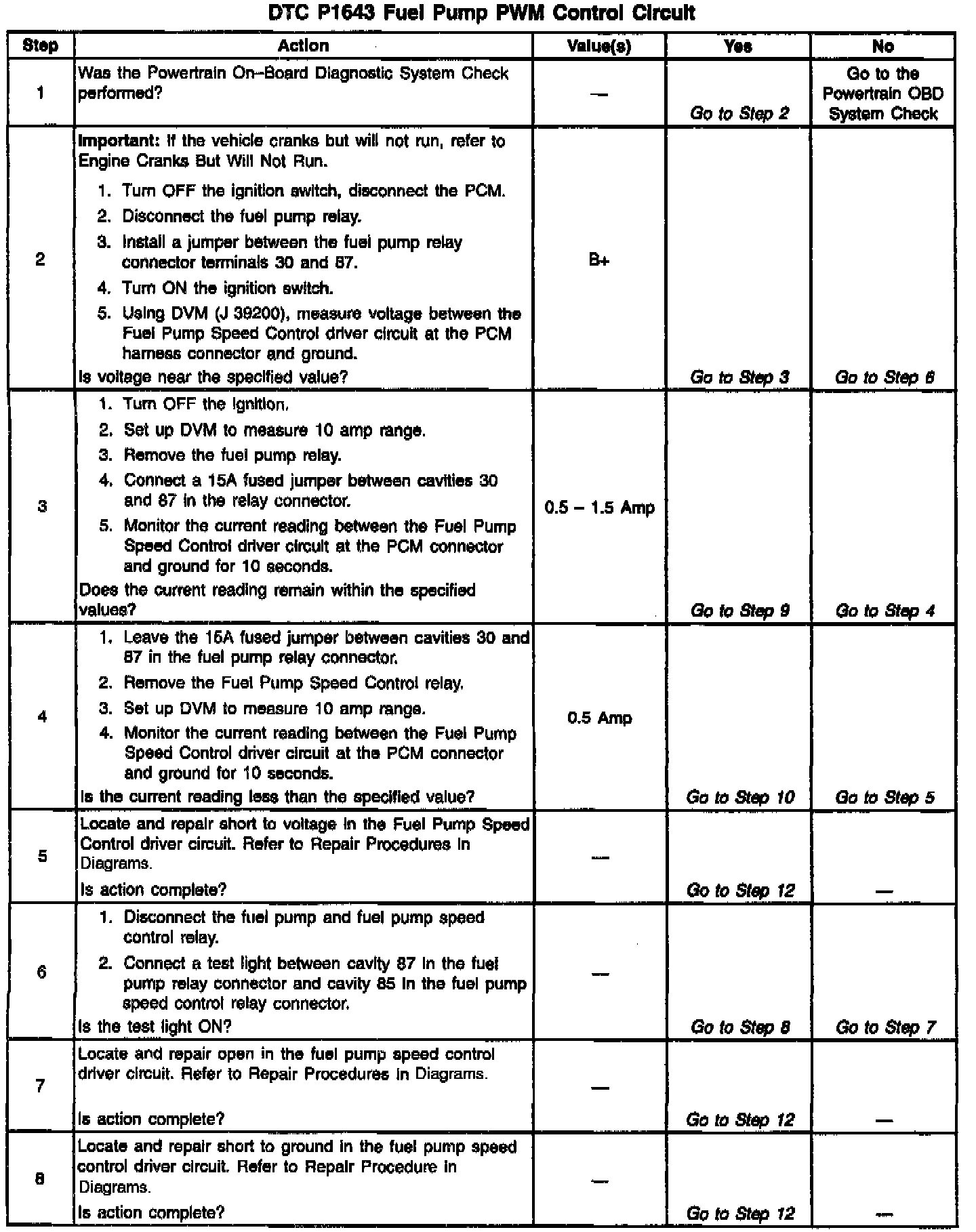 Output Driver Modules (ODMs) are used by the PCM to turn on many of the current-driven devices that are needed to control various engine and Transaxle functions. Each ODM is capable of controlling up to 7 separate outputs by applying ground to the device which the PCM is commanding ON. Unlike the Quad Driver Modules (QDMs) used in prior model years, ODMs have the capability of diagnosing each output circuit individually. DTC P1643 set indicates an improper voltage level has been detected on ODM A output 3, which controls the Fuel Pump Pulse Width Modulation (PWM) signal to the fuel pump control module.