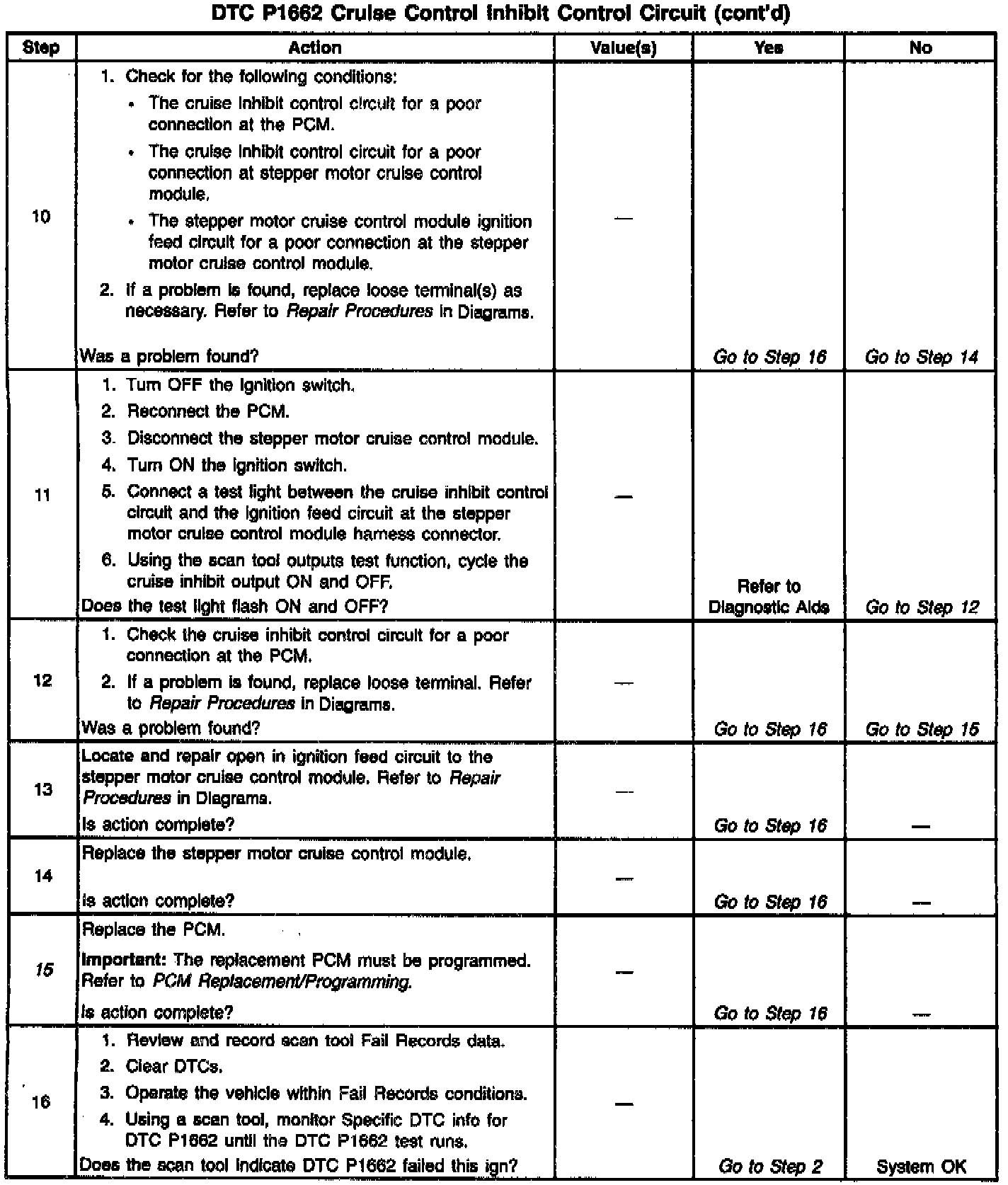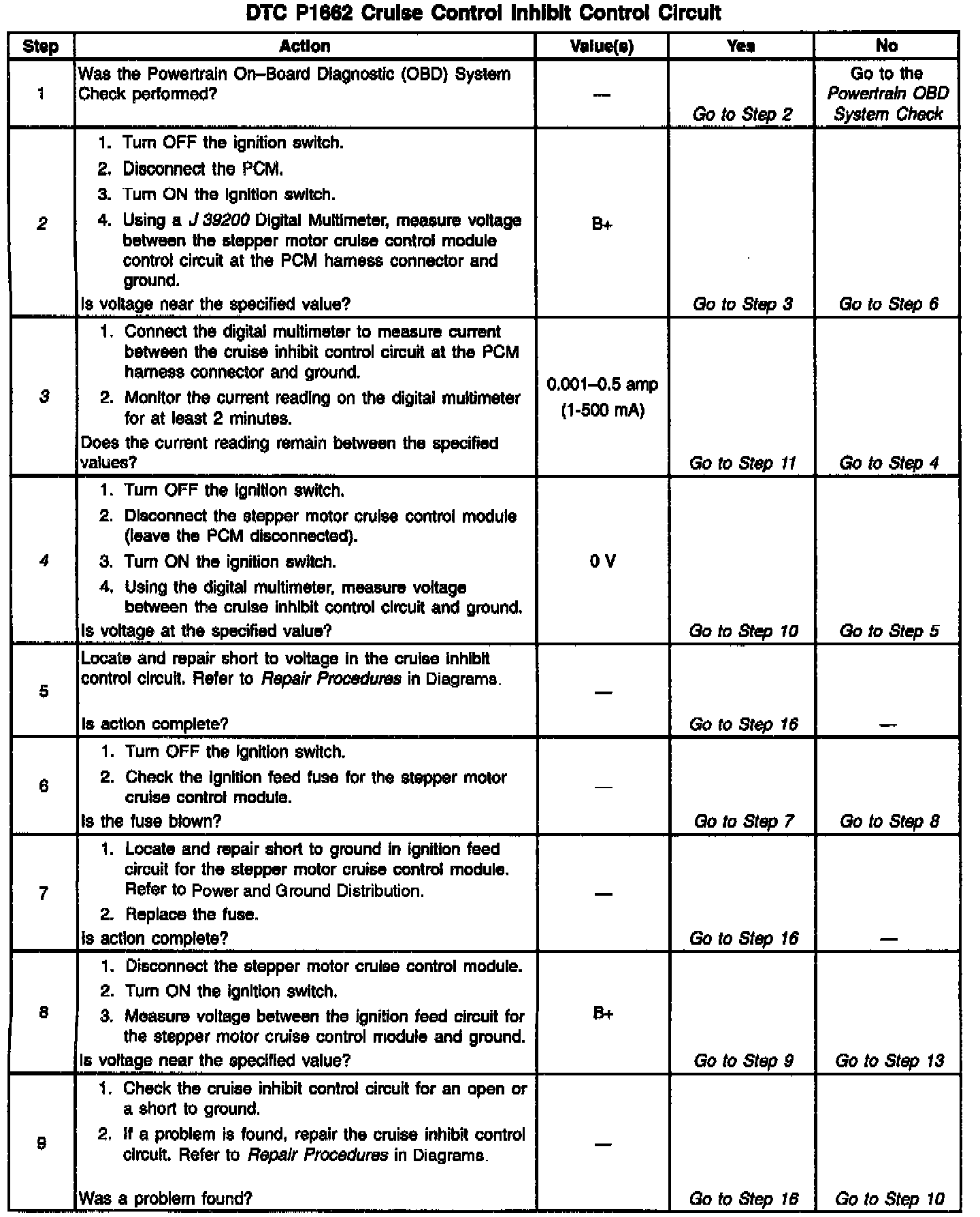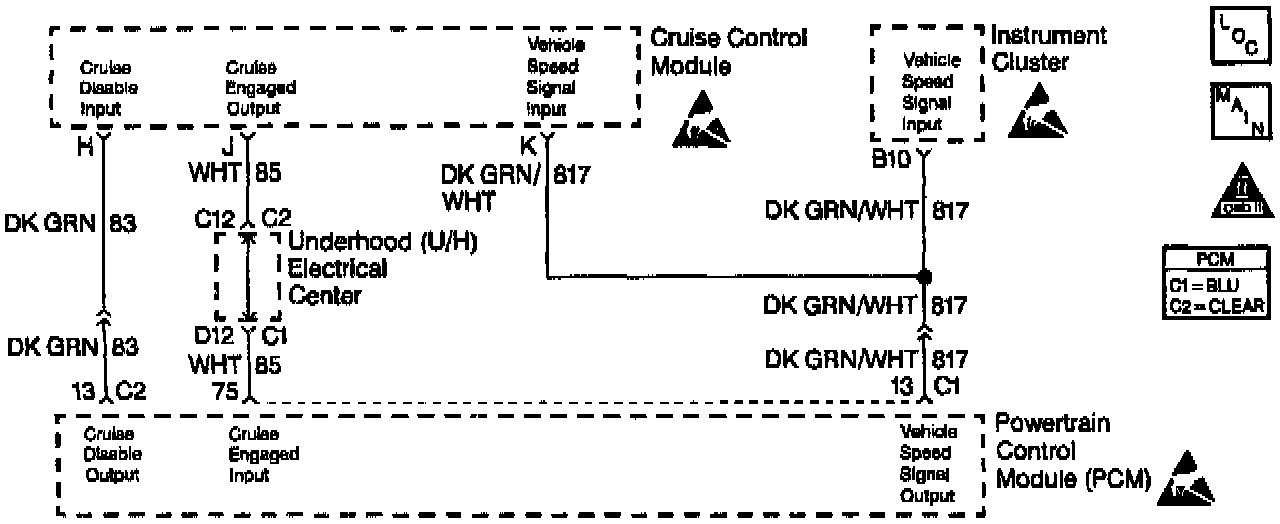 Output Driver Modules (ODMs) are used by the PCM to turn on many of the current-driven devices that are needed to control various engine and Transaxle functions. Each ODM is capable of controlling up to 7 separate outputs by applying ground to the device which the PCM is commanding ON. Unlike the Quad Driver Modules (QDMs) used in prior model years, ODMs have the capability of diagnosing each output circuit individually. DTC P1662 set indicates an improper voltage level has been detected on ODM C output 2, which controls the stepper motor cruise control inhibit circuit