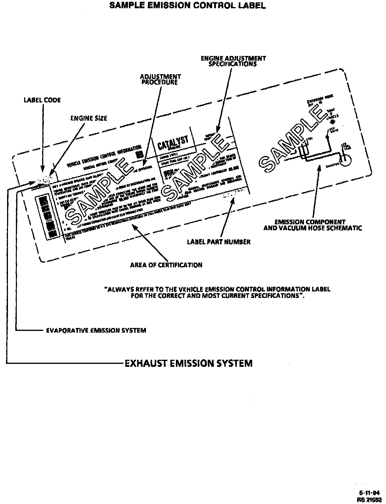 The underhood "Vehicle Emissions Control Information" label, a sample of which is located in the accompanying image, contains important emission specifications and setting procedures. In the upper left corner is exhaust emission information which identifies the year, the manufacturing division of the engine, the displacement of the engine in liters the class of vehicle, and type of fuel metering. The label also contains an illustrated emission components and vacuum hose schematic.