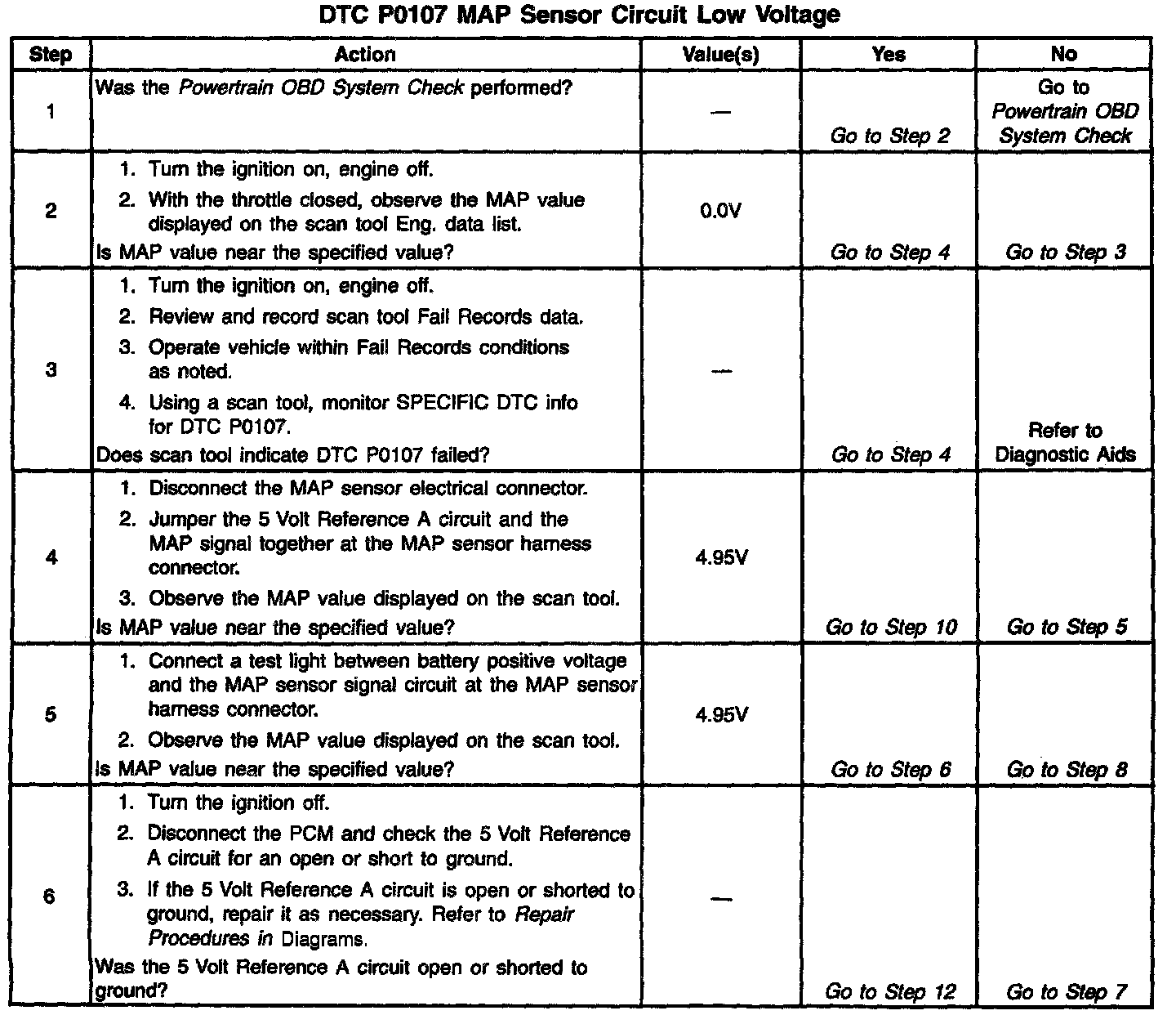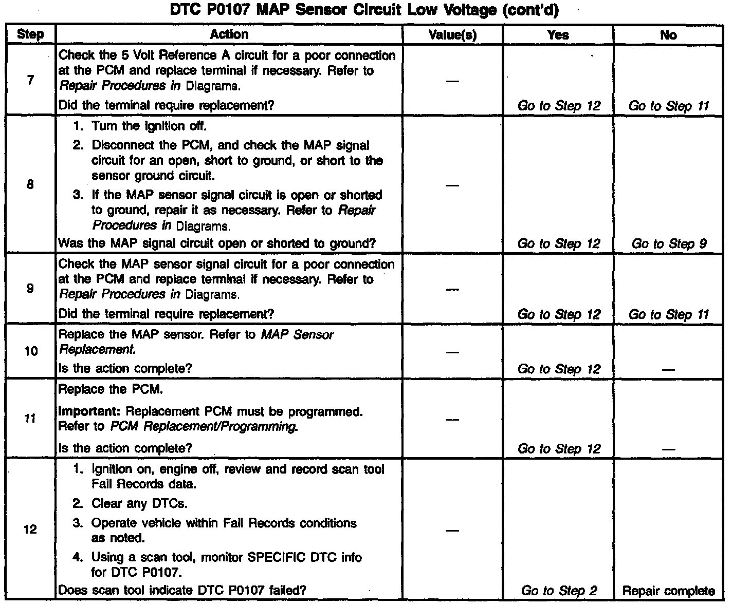 The MAP sensor is used to determine manifold pressure changes while the linear EGR flow test diagnostic is being run (refer to DTC P0401), to determine engine vacuum level for some other diagnostics and to determine barometric pressure (BARO). The PCM monitors the MAP signals for voltages outside the normal range of the MAP sensor. If the PCM detects a MAP signal voltage that is excessively high, DTC P0107 will be set.