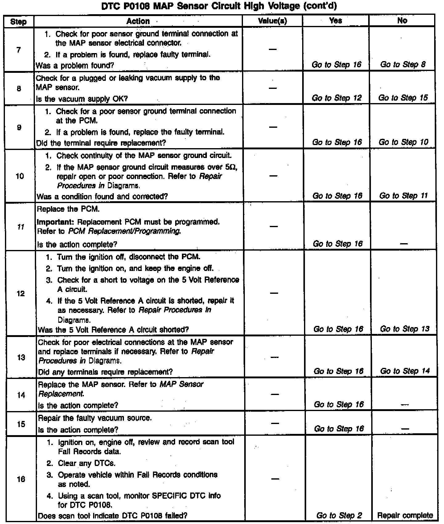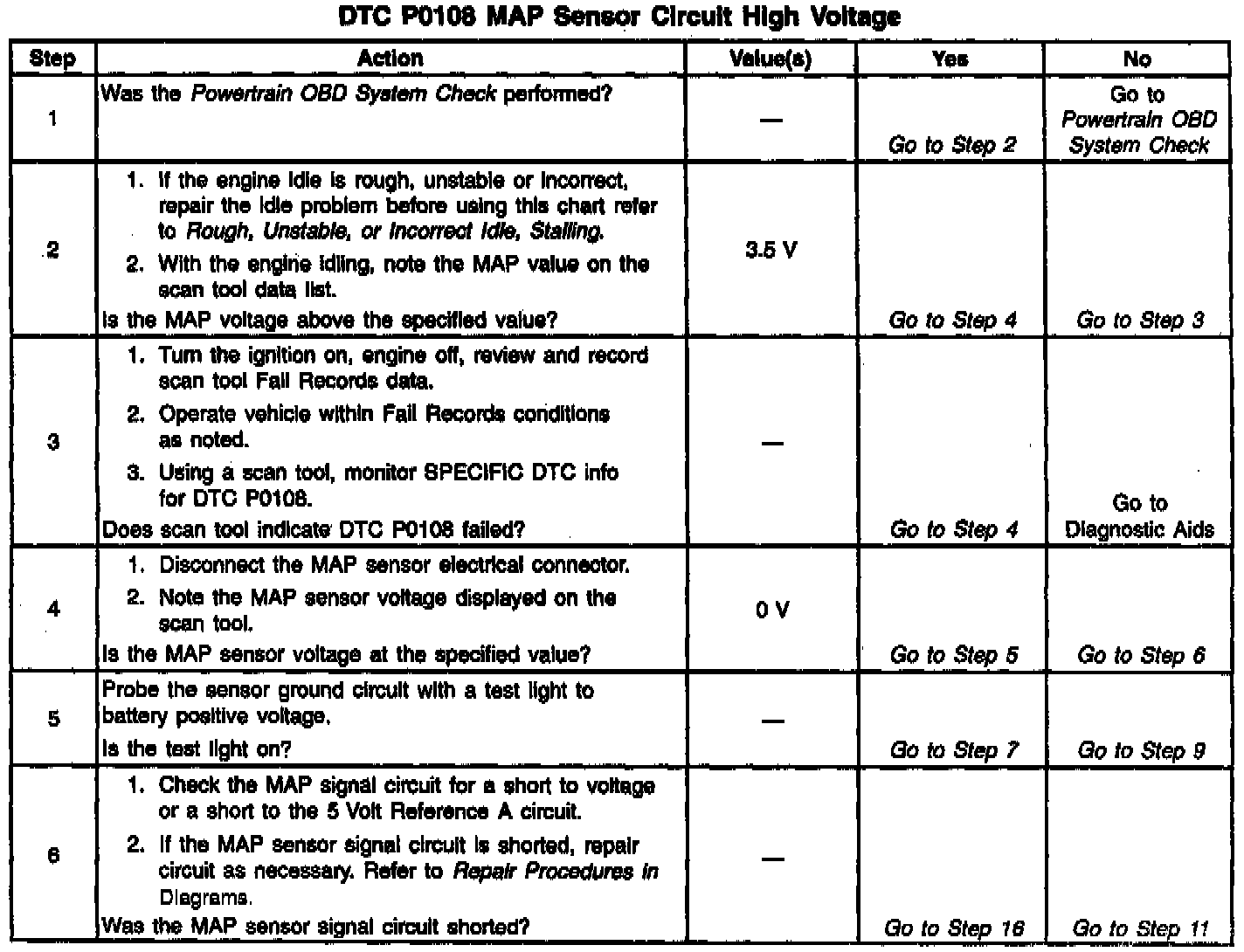 The MAP sensor is used to determine manifold pressure changes while the linear EGR flow test diagnostic is being run (refer to DTC P0401), to determine engine vacuum level for some other diagnostics and to determine barometric pressure (BARO). The PCM monitors the MAP signals for voltages outside the normal range of the MAP sensor. If the PCM detects a MAP signal voltage that is excessively high, DTC P0108 will be set.