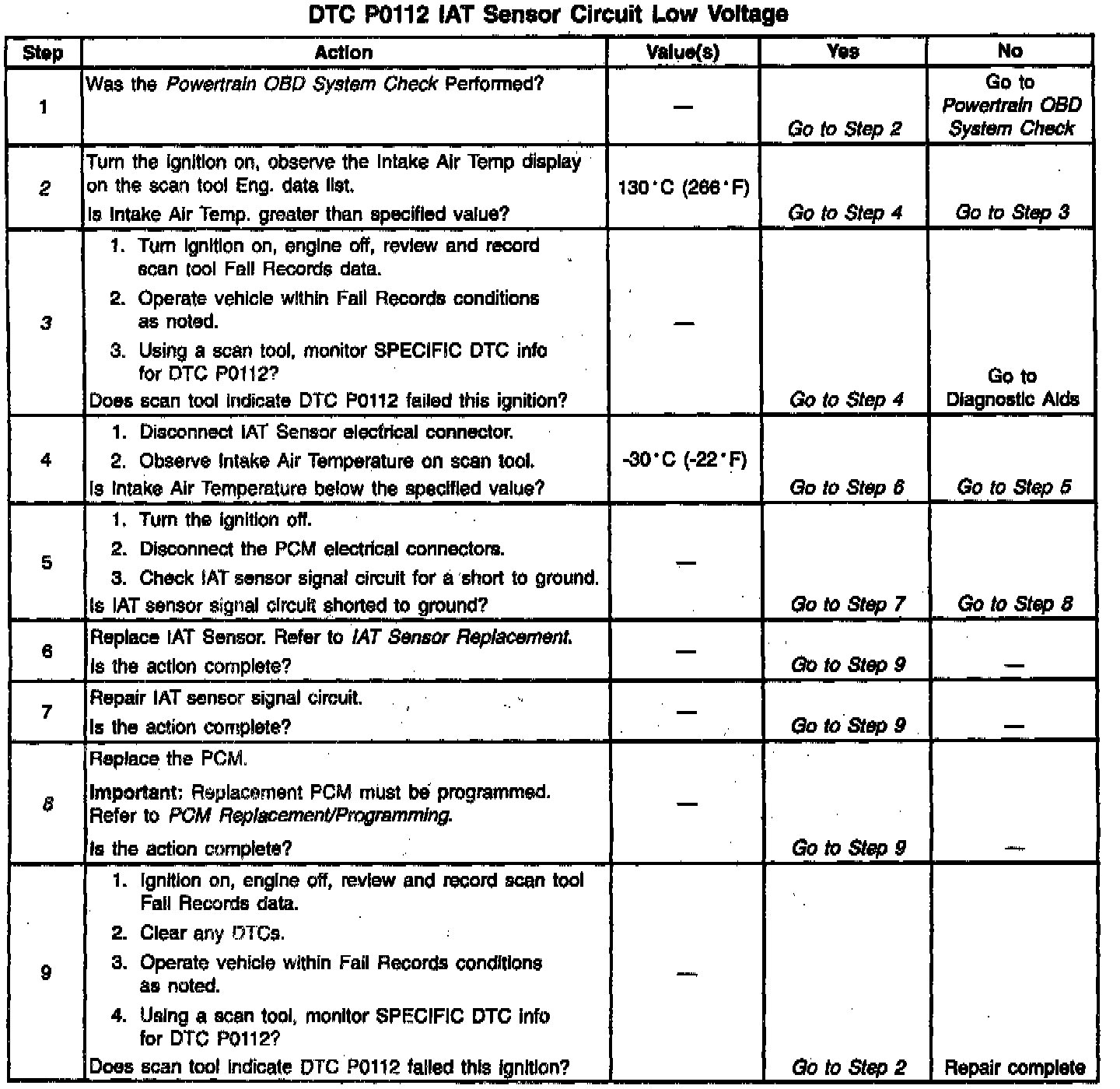 3. If DTC P0113 can be repeated only by duplicating the Fail Records conditions, refer to Temperature vs Resistance. The table may be used to test the IAT sensor at various temperatures to evaluate the possibility of a shifted sensor that may be open above or below a certain temperature. If this is the case, replace the IAT sensor. If the at sensor appears to be OK, the fault is intermittent; refer to Diagnostic Aids.