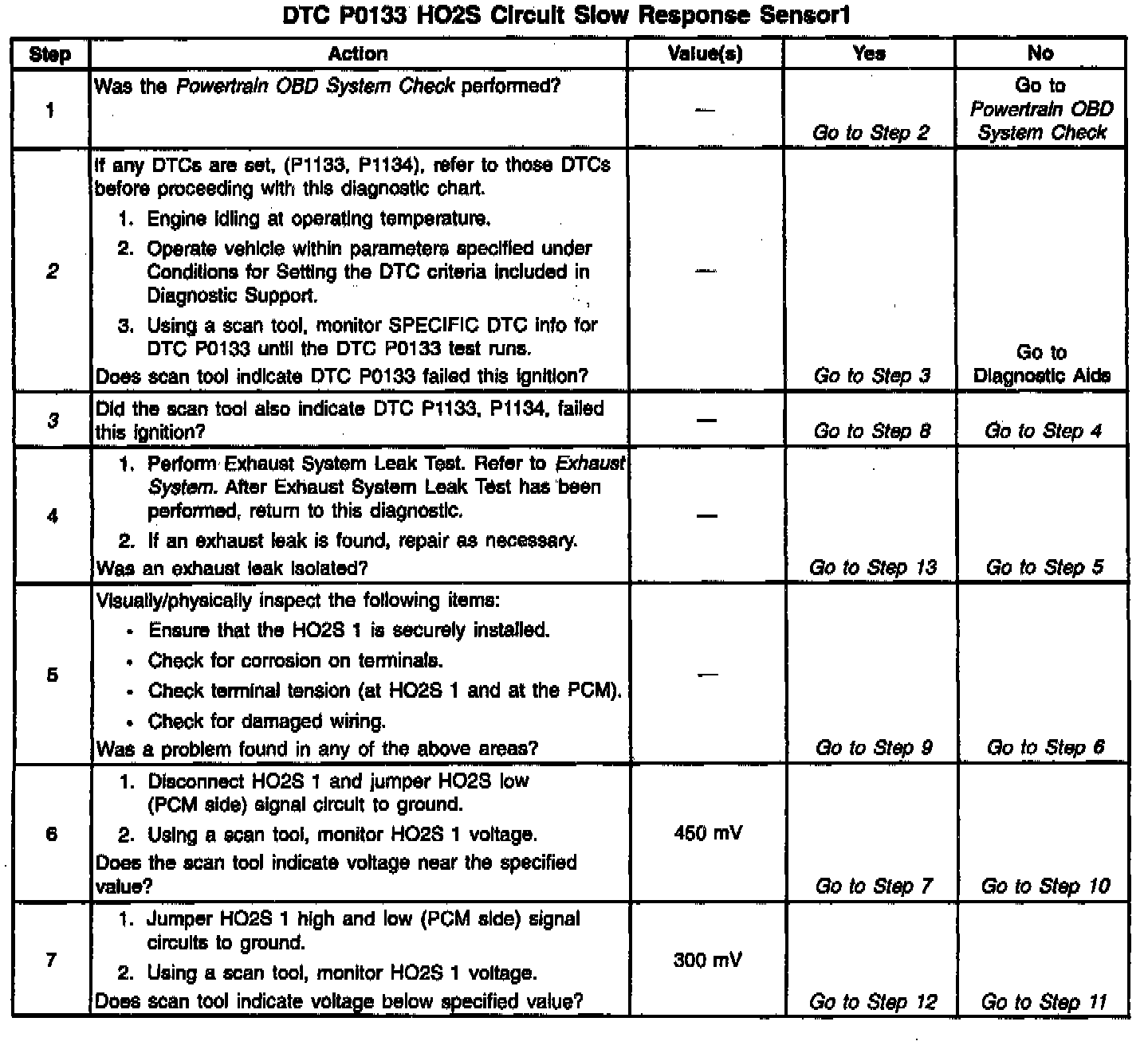 The PCM continuously monitors the Heated Oxygen Sensor (HO2S) activity for 100 seconds. During the monitoring period the PCM counts the number of times that the a rich to lean and lean to rich response is indicated and adds the amount of time it took to complete all transitions. With this information, an average time for each transition can be determined. If the average response time is too slow, a DTC P0133 will be set.